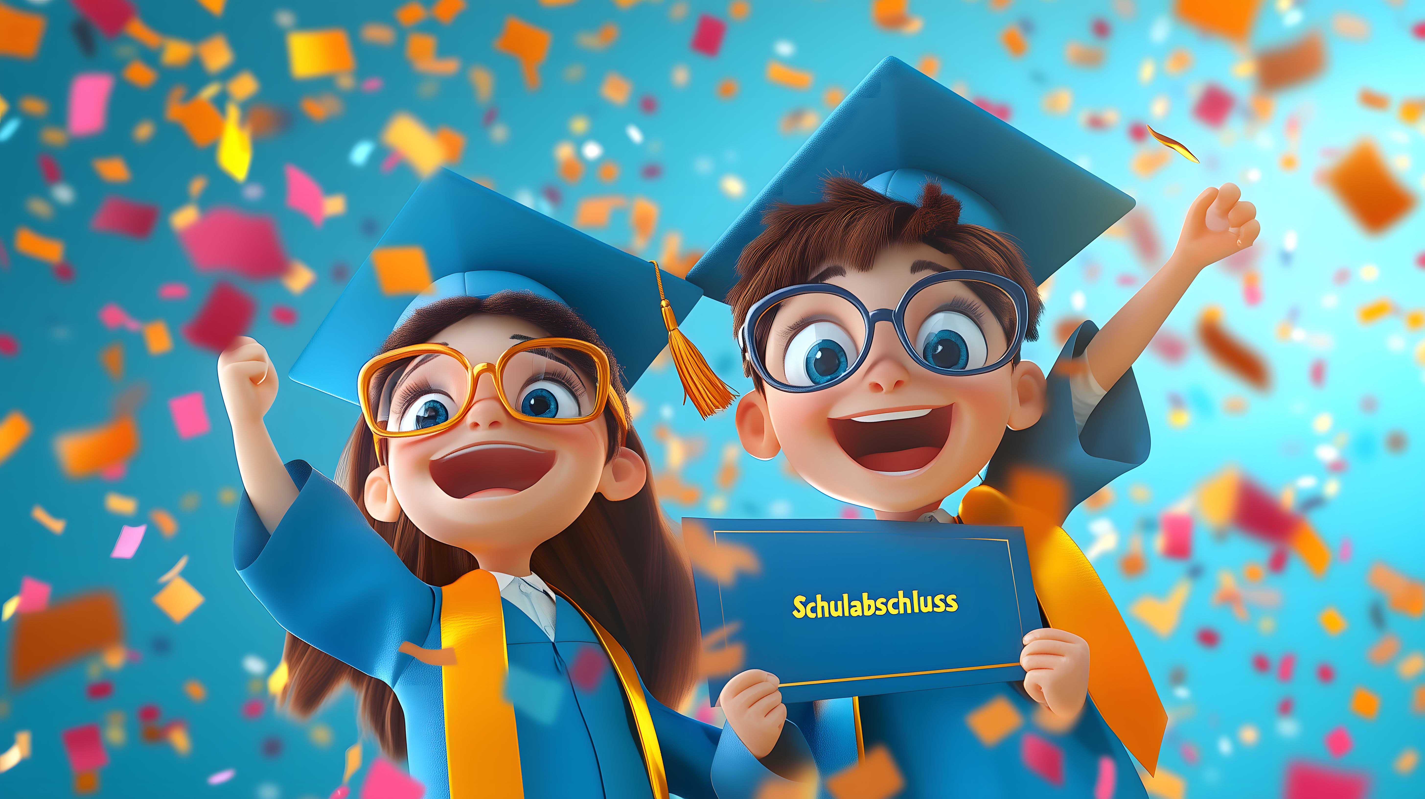 Das farbenfrohe Bild zeigt zwei glückliche Kinder, die ihren Schulabschluss feiern. Sie tragen Absolventenkappen und halten stolz ihre Zeugnisse in den Händen, während bunte Konfetti durch die Luft wirbeln. Die Kinder strahlen vor Freude und Zufriedenheit über ihren Erfolg. Dieses Stockfoto in hoher Auflösung eignet sich perfekt für die Verwendung in Blogs, Newslettern, Social-Media-Beiträgen oder Werbematerialien rund um Bildung, Ausbildung und Karriere. Das Bild steht unter einer Creative-Commons-Lizenz zur kostenlosen Nutzung zur Verfügung.