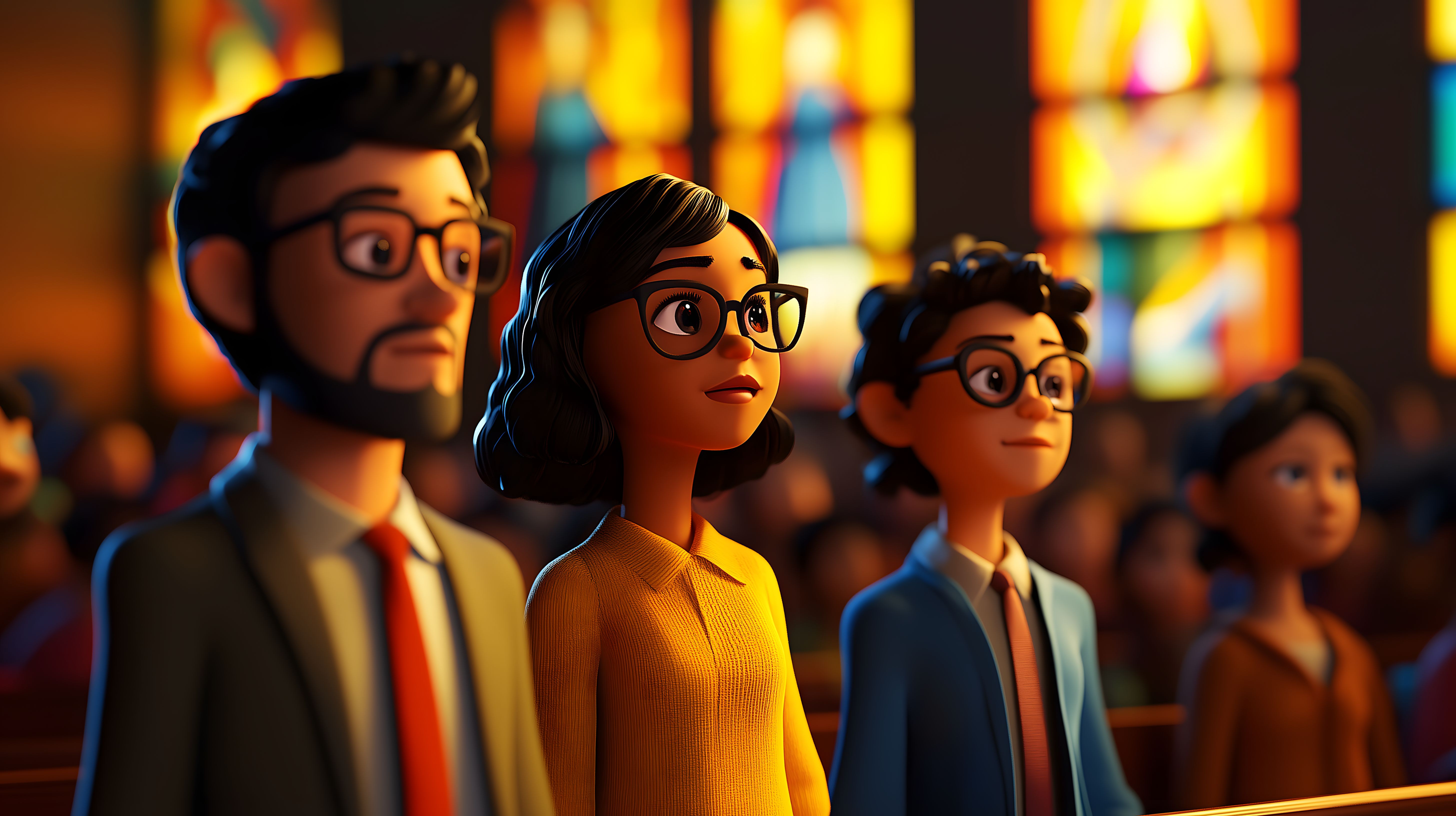 Dieses lebendige Bild zeigt eine Familie, die an einem Gottesdienst in einer Kirche teilnimmt. Im Vordergrund sehen wir einen Vater, eine Mutter und zwei Kinder, die andächtig vor den farbenfrohen Buntglasfenstern stehen. Die Szene ist geprägt von warmen Farben und einer feierlichen Stimmung, die die Spiritualität und Gemeinschaft innerhalb der Kirchengemeinde widerspiegelt. Dieses Stockfoto eignet sich hervorragend für Verwendungen in Blogs, Newslettern oder Sozialen Medien im Kontext von Religion, Kultur und Tradition. Es ist kostenlos, hochauflösend und unter einer Creative-Commons-Lizenz verfügbar.