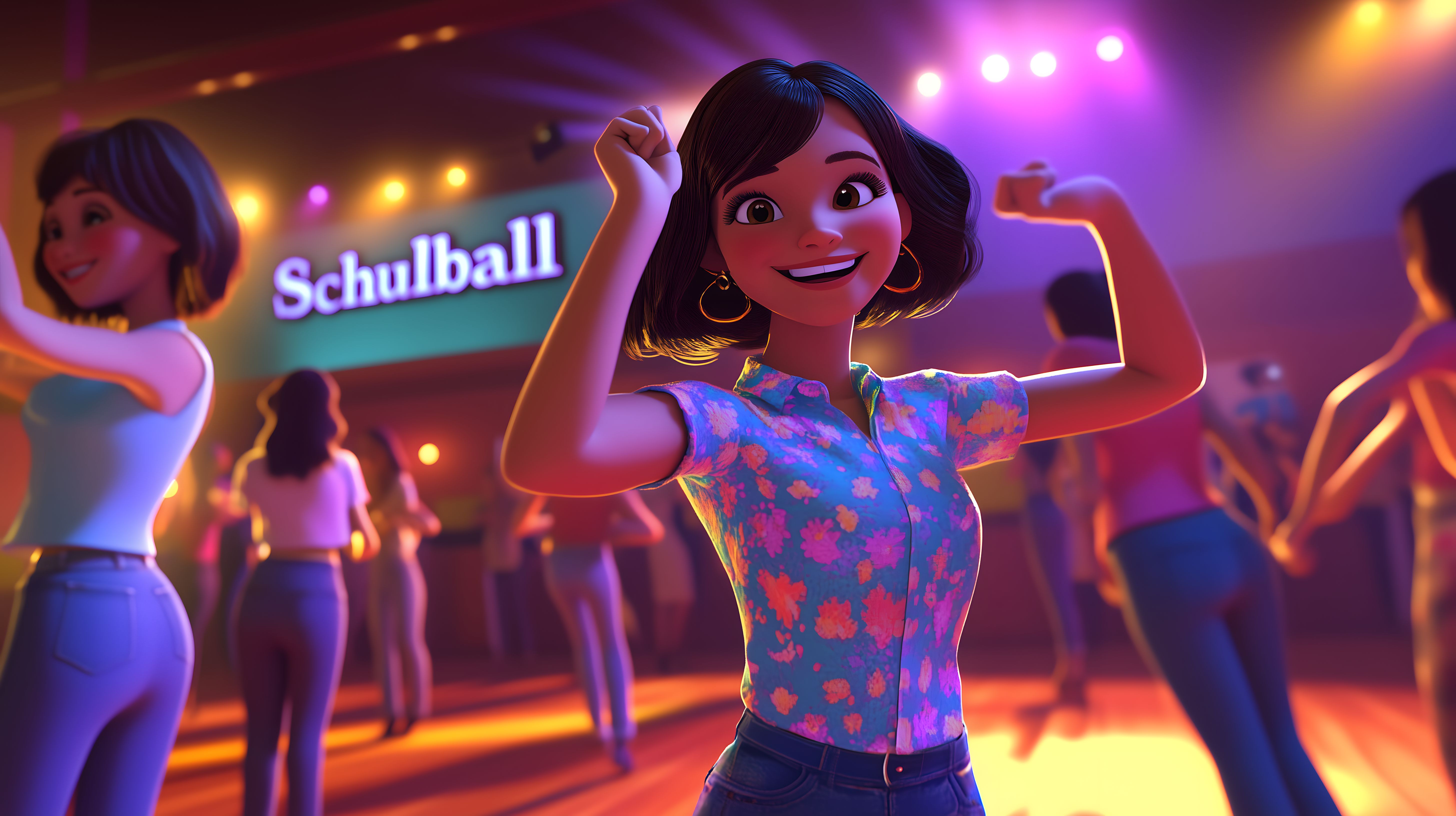 Dieses farbenfrohe Stockfoto zeigt eine Szene von einem Schultanzball mit strahlender Beleuchtung und lebendiger Stimmung. Im Zentrum der Aufnahme steht eine junge Frau, die voller Freude und Energie tanzt. Im Hintergrund sind weitere Tanzende sowie eine Bühne mit der Aufschrift 'Schulball' zu erkennen. Das Bild strahlt eine positive, jugendliche Atmosphäre aus und wäre ideal für die Illustration von Artikeln oder Social-Media-Posts rund um Feiern, Events oder das Schulleben. Als hochauflösendes und kostenloses Creative-Commons-Foto lässt es sich vielseitig in Blogs, Newslettern oder Werbekampagnen einsetzen.
