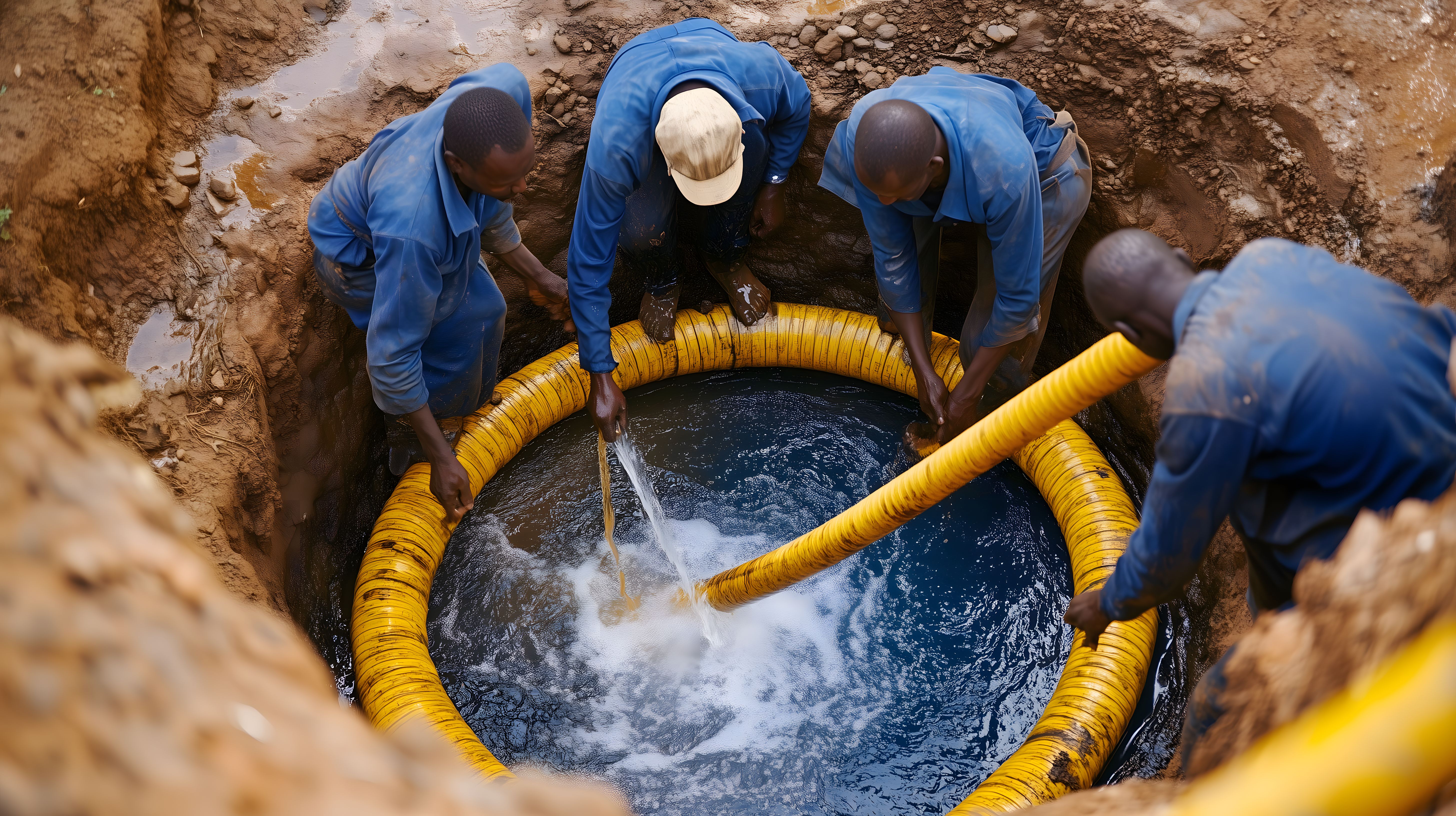 Das Bild zeigt eine Gruppe von Männern in blauen Overalls, die gemeinsam einen Brunnen bauen. Sie stehen in einem Graben und verwenden gelbe Wasserschläuche, um Wasser in das Loch zu leiten. Die Männer arbeiten hart, um die Infrastruktur in einer ländlichen Gegend zu verbessern und den Zugang zu sauberem Trinkwasser zu ermöglichen. Dieses Foto eignet sich hervorragend für die Verwendung in Blogs, Newslettern oder Werbekampagnen, die sich mit Entwicklungshilfe, sozialer Verantwortung oder Freiwilligenarbeit befassen. Als kostenloses Stockfoto in hoher Auflösung und unter Creative-Commons-Lizenz kann es frei genutzt werden.