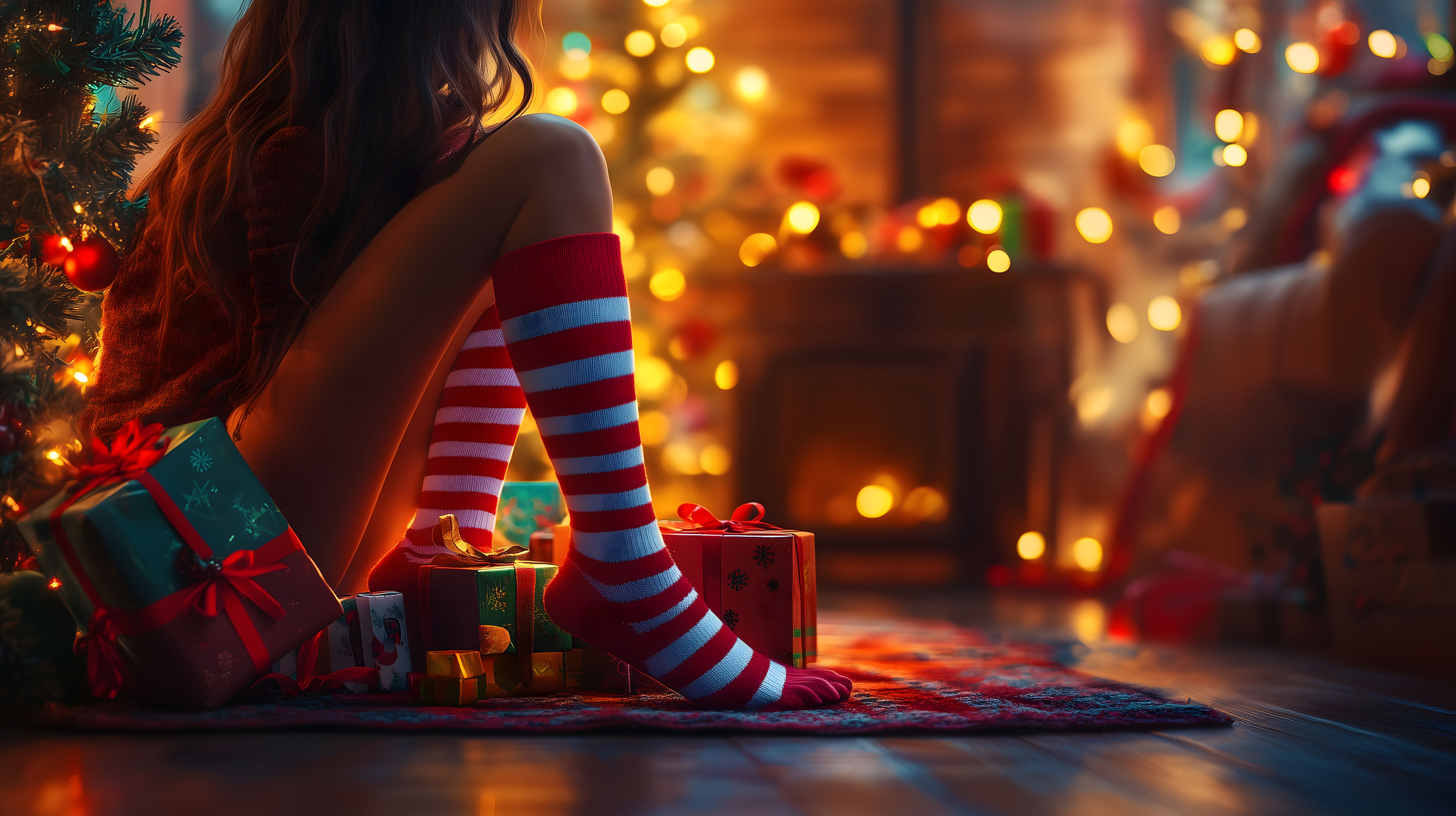 Dieses festliche Weihnachtsfoto zeigt eine Frau in gemütlicher Pose vor dem Kamin, umgeben von Weihnachtsdekorationen und Geschenken. Die roten und weißen Strümpfe der Frau, die Lichterkette und der Kamin schaffen eine warme, gemütliche Atmosphäre. Das Bild strahlt Ruhe und Entspannung aus und eignet sich perfekt für den Einsatz in Weihnachtsdekorationen, Blogbeiträgen, Newslettern oder Werbekampagnen. Als kostenloses Stockfoto in hoher Auflösung unter Creative-Commons-Lizenz kann es frei verwendet werden.