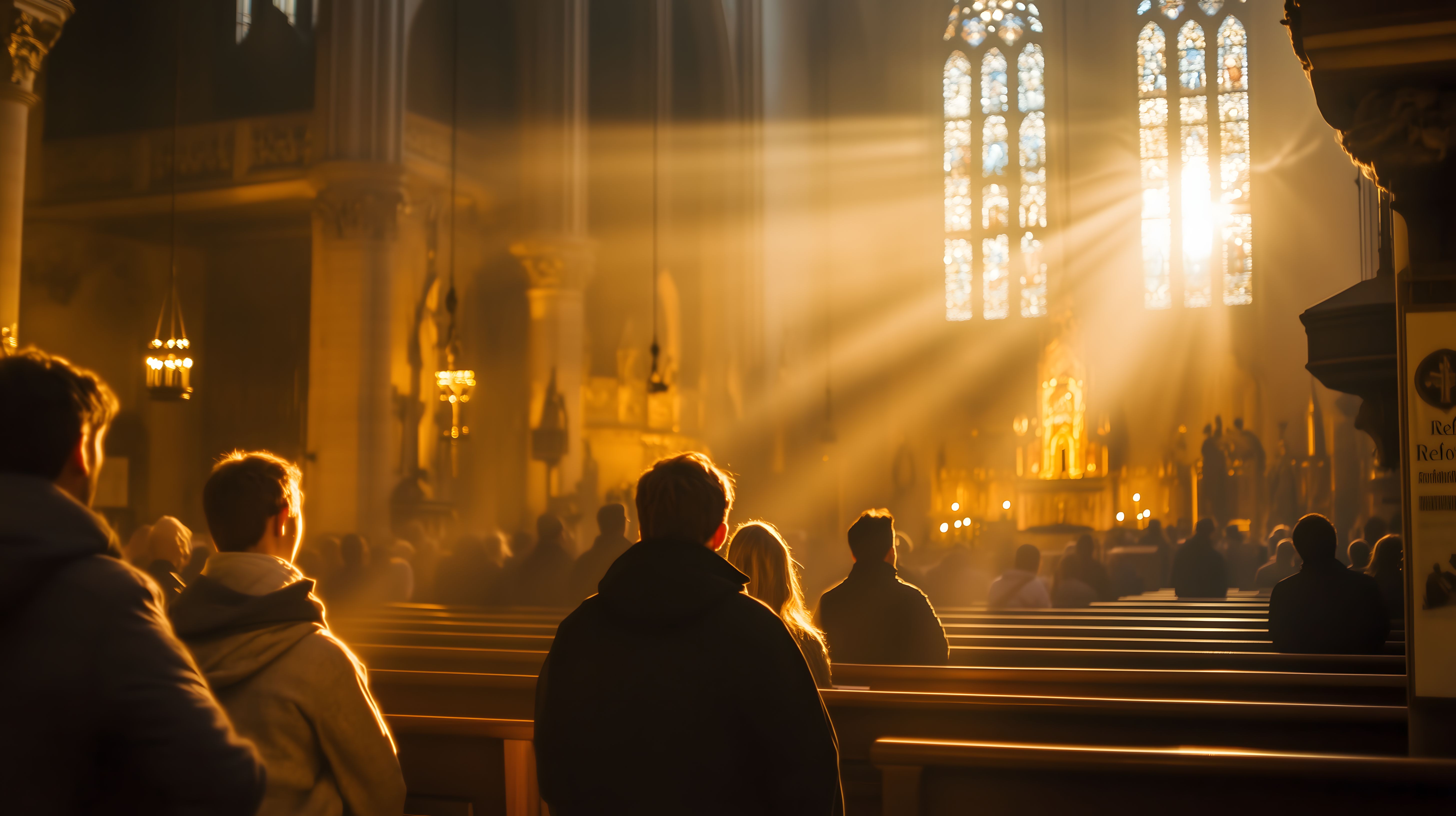 Dieses faszinierende Foto zeigt die beeindruckende Atmosphäre innerhalb einer gotischen Kathedrale. Das warme, goldene Licht der Sonne durchflutet den Innenraum und erzeugt ein mystisches Ambiente. Die Fenster mit ihren kunstvollen Glasmalereien werfen malerische Lichtmuster auf die Besucher, die andächtig in den Kirchenbänken sitzen. Die Kombination von Architektur, Licht und Schatten schafft eine besondere spirituelle Stimmung, die den Betrachter in eine andere Welt entführt. Dieses hochwertige Stockfoto in hoher Auflösung ist ideal für Blogs, Newsletter, soziale Medien oder Werbezwecke rund um Themen wie Kirche, Religion, Glaube oder Spiritualität. Es steht unter einer kostenlosen Creative-Commons-Lizenz zur Verfügung.