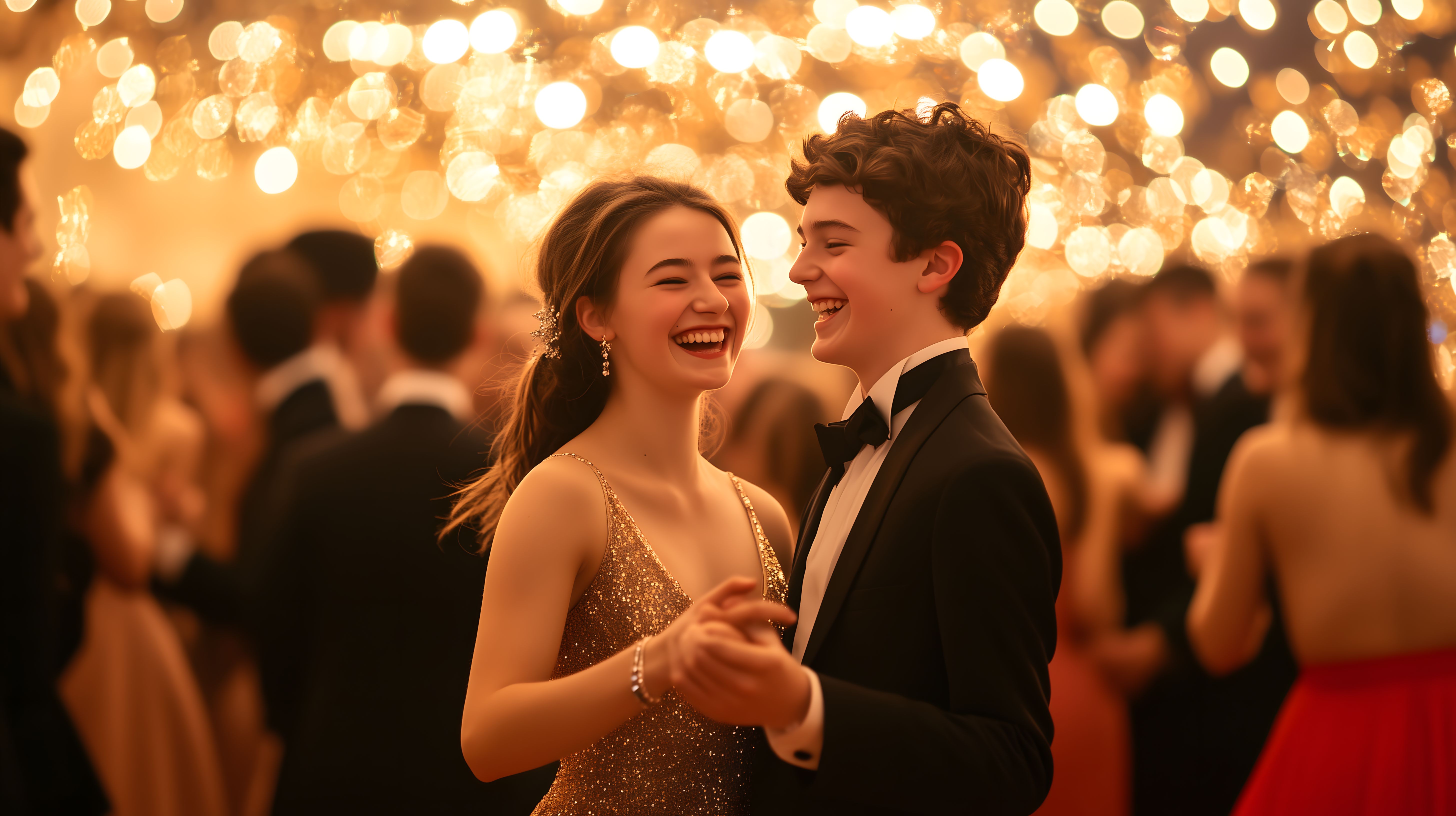 Das Foto zeigt ein junges Paar, das auf einer festlichen Abendveranstaltung tanzt. Die Frau trägt ein glitzerndes, goldenes Abendkleid und der Mann einen schwarzen Frack. Sie lachen und blicken sich glücklich an, während sie von einer Atmosphäre warmer, goldener Lichter umgeben sind. Das Bild strahlt Freude, Leichtigkeit und Romantik aus. Dieses stimmungsvolle Stockfoto eignet sich hervorragend für den Einsatz in Artikeln, Blogbeiträgen oder Social-Media-Beiträgen rund um Themen wie Feste, Partys, Feiern oder Liebesbeziehungen. Das hochauflösende, kostenfrei verfügbare Foto steht unter der Creative-Commons-Lizenz zur Verfügung.