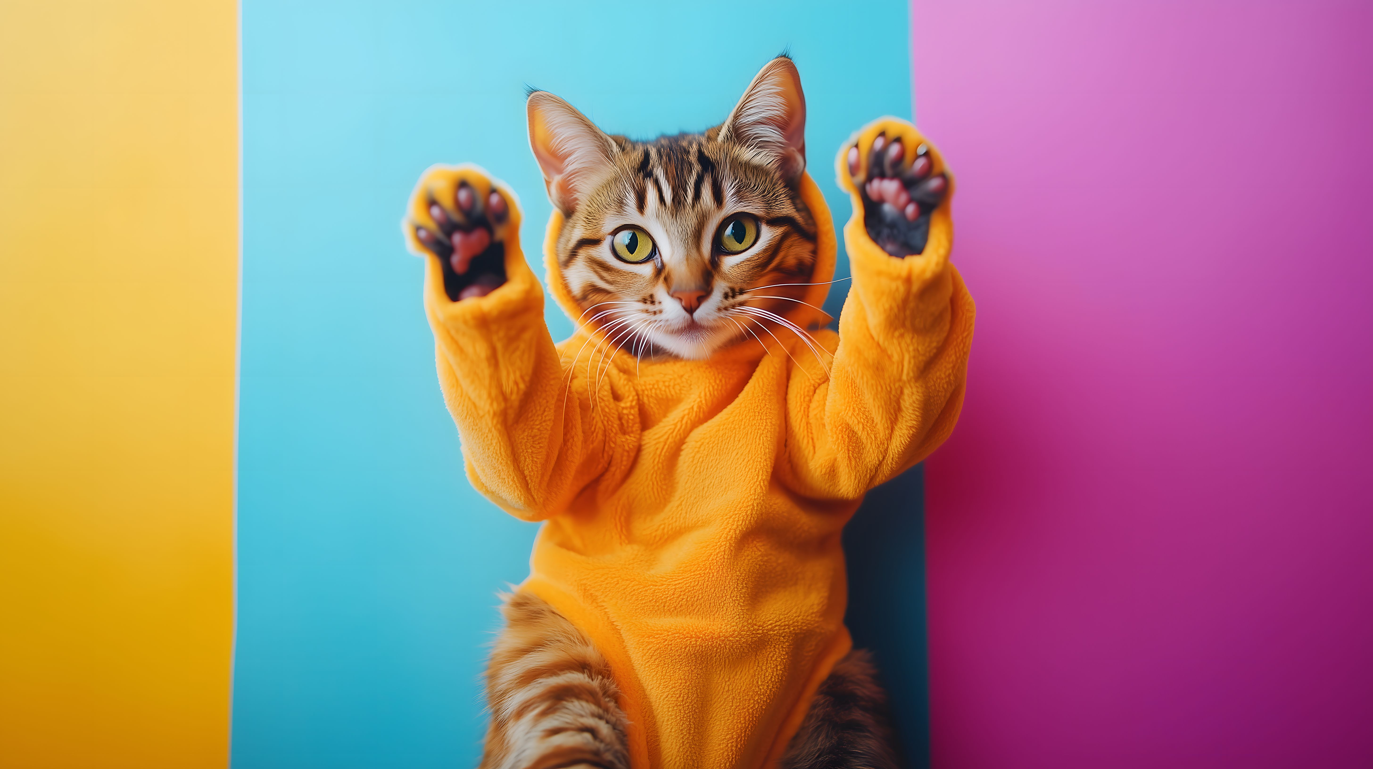 Dieses fröhliche Foto zeigt ein Kätzchen, das in einem orangefarbenen Kostüm vor einem bunten Hintergrund posiert. Das Kätzchen blickt direkt in die Kamera mit seinen leuchtenden Augen und erhobenen Pfoten, als würde es spielen. Die Komposition mit den leuchtenden Farben Gelb, Türkis und Pink schafft einen lebendigen, einladenden Eindruck.
