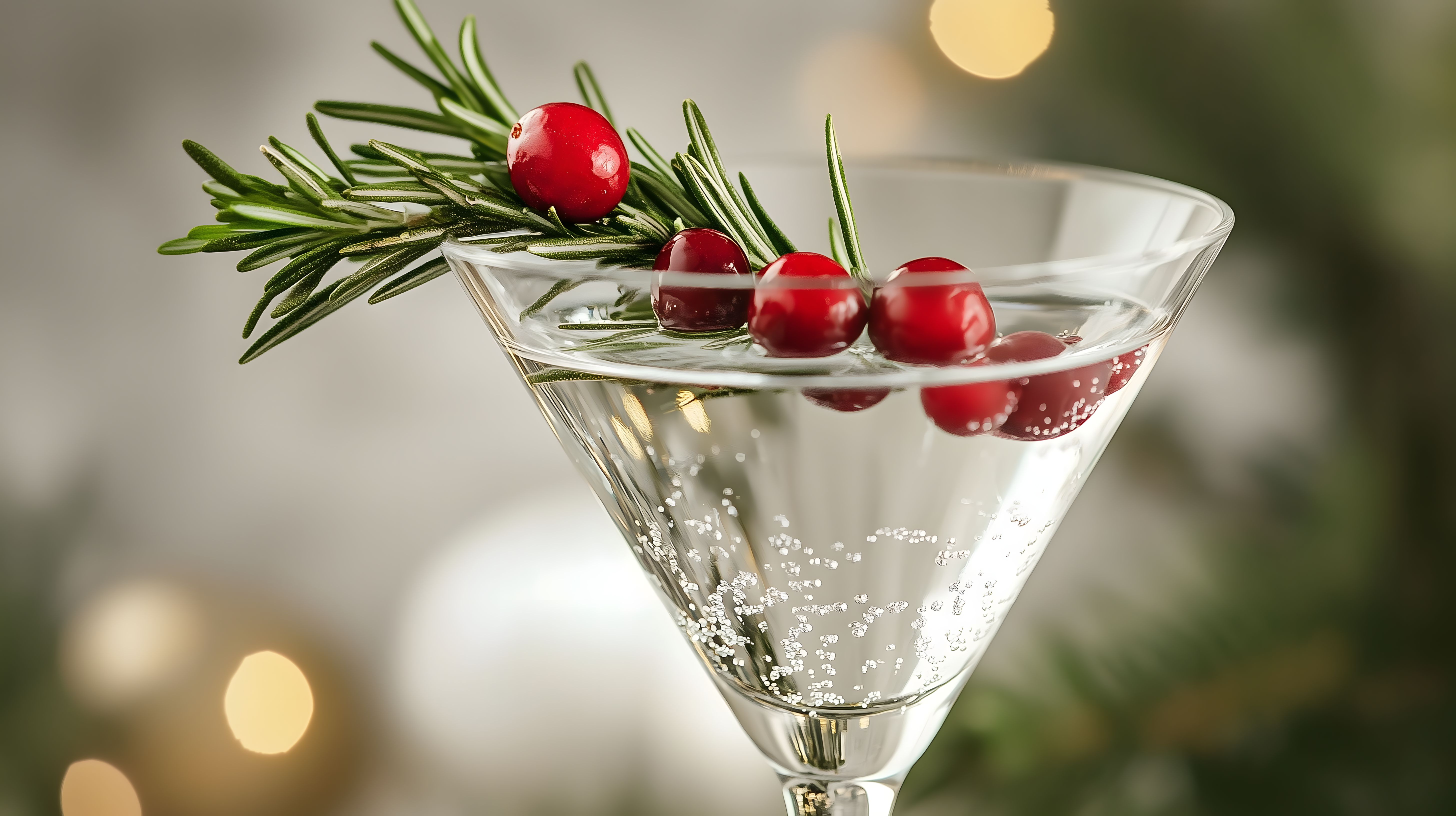 Dieses stimmungsvolle Bild zeigt einen festlichen Cocktail, der ideal für Weihnachten oder Silvester geeignet ist. Der Drink präsentiert sich in einem eleganten Martiniglas und ist mit frischen Cranberries und einem Zweig Rosmarin dekoriert. Die roten Beeren und das sattes Grün des Rosmarins schaffen einen schönen Kontrast, der durch das klare Glas und die funkelnden Eiswürfel betont wird. Die unscharfe Hintergrundbeleuchtung erzeugt einen stimmungsvollen, weihnachtlichen Rahmen. Dieses hochauflösende Stockfoto ist kostenfrei und unter der Creative-Commons-Lizenz verwendbar.