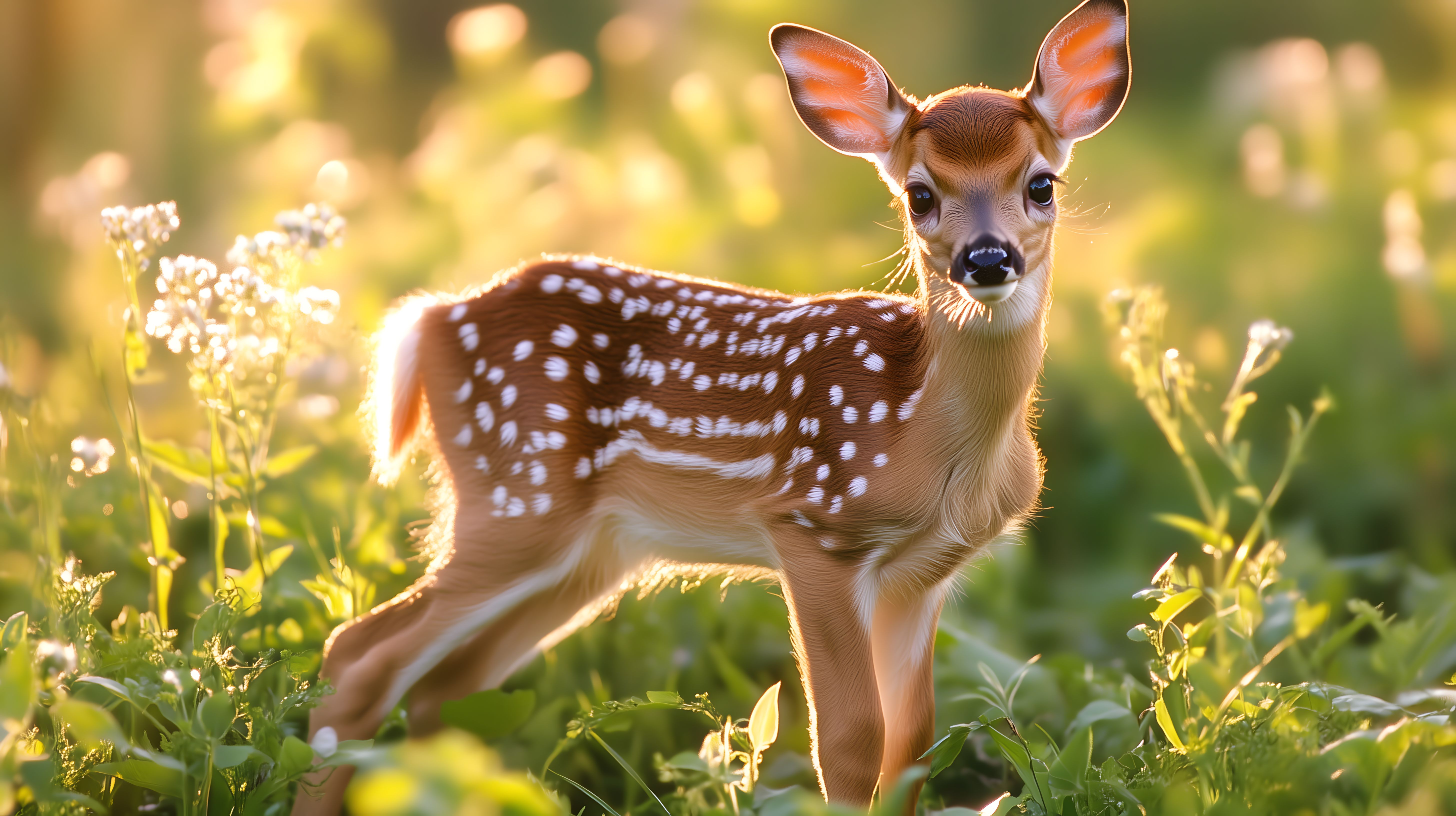 Das Bild zeigt ein junges Rehkitz, das in einer sonnigen Blumenwiese steht. Das Rehkitz hat einen zierlichen, schlanken Körper mit geflecktem Fell und spitze Ohren, die es aufmerksam aufgestellt hat. Es steht umgeben von bunten Wildblumen, die in der Nachmittagssonne leuchten. Die Komposition und warmen Farbtöne verleihen dem Bild eine friedliche, idyllische Stimmung. Dieses Foto eignet sich hervorragend für die Verwendung in Blogs, Newslettern, Social-Media-Beiträgen oder Werbekampagnen, die eine natürliche, harmonische Atmosphäre vermitteln möchten. Als hochwertiges, kostenloses Stockfoto unter Creative-Commons-Lizenz kann es dabei vielseitig eingesetzt werden.