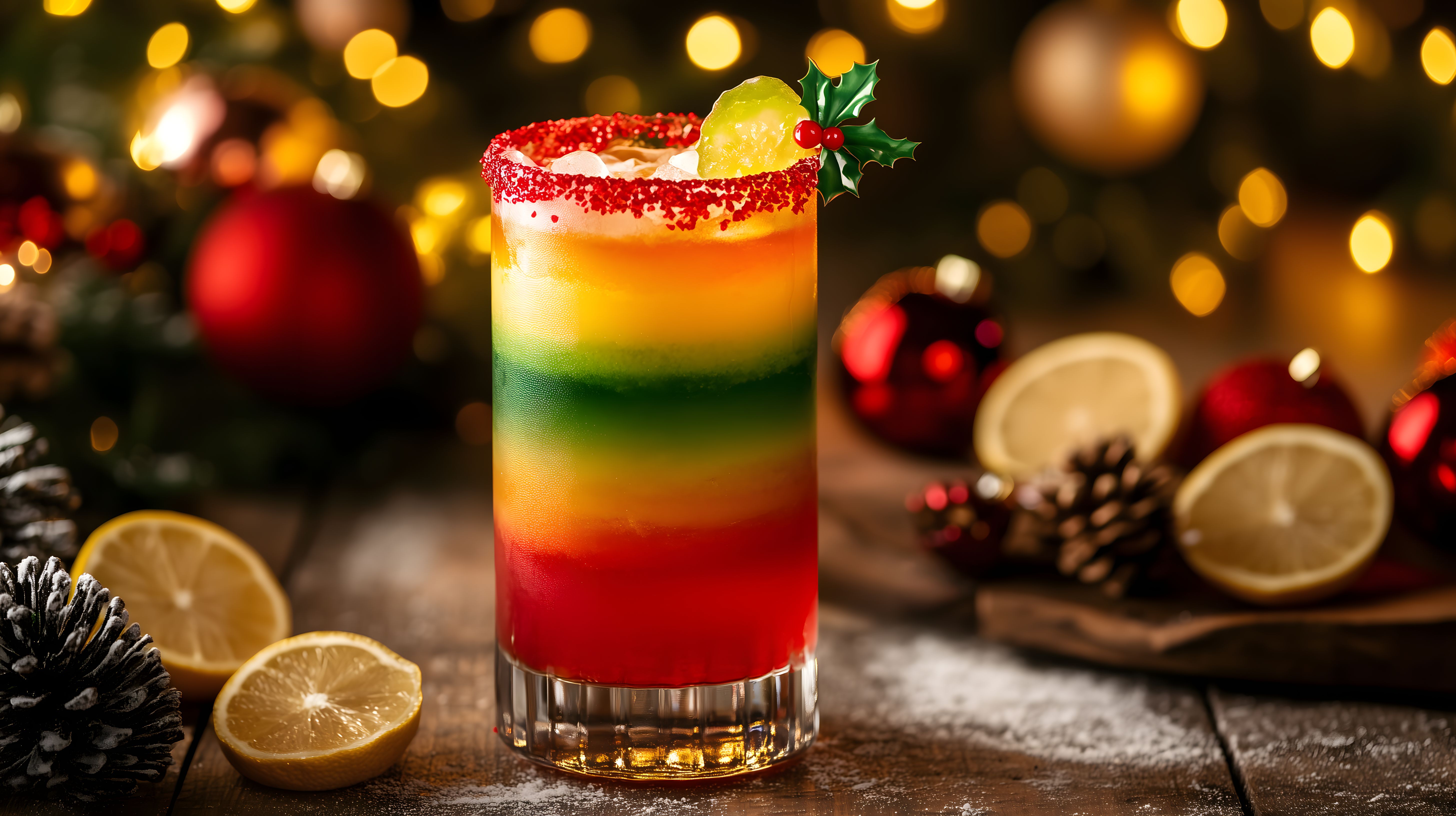 Dieses festliche Stockfoto zeigt einen Tequila Sunrise Cocktail, der in weihnachtlicher Umgebung dekoriert wurde. Der Drink ist in Schichten in einem hohen Glas angerichtet und mit roten Beeren und einem Zitrusfruchtstück garniert. Der Hintergrund ist von Weihnachtsdekorationen, Lichterketten und Kerzen geprägt, die eine stimmungsvolle, gemütliche Atmosphäre schaffen. Das Foto eignet sich perfekt für die Verwendung in Weihnachts-Blogs, Newsletter-Designs, Social-Media-Beiträgen oder Werbekampagnen rund um die Feiertage. Das hochauflösende Bild steht unter einer Creative-Commons-Lizenz zur kostenlosen Nutzung zur Verfügung.
