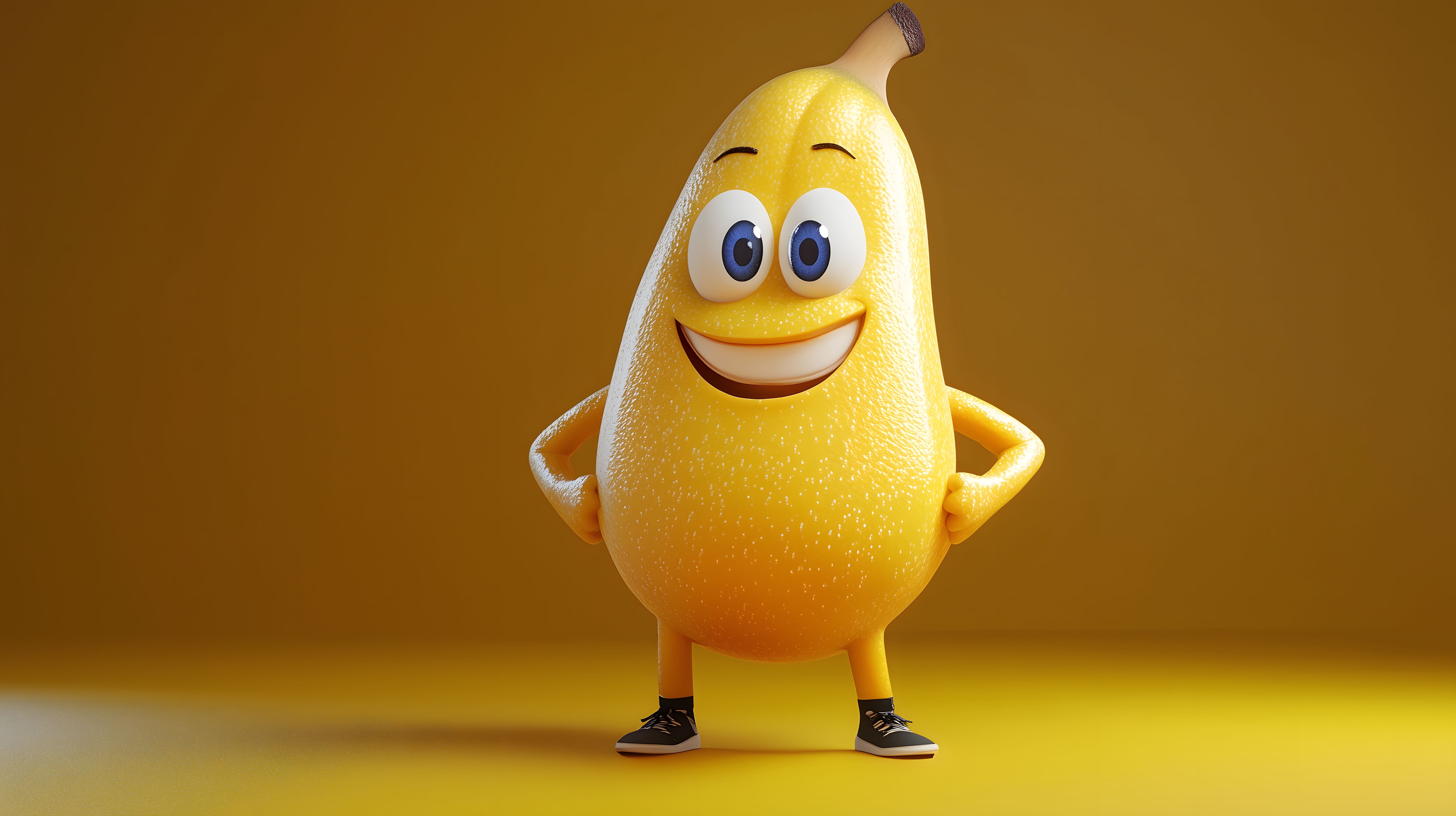 Dieses fröhliche Cartoon-Bild zeigt eine lächelnde 3D-Banane mit erhobenen Armen in einer kräftig gelben Farbgebung. Die Banane strahlt mit großen Augen und breitem Grinsen Freude und Selbstbewusstsein aus. Dieses lebendige Foto eignet sich hervorragend für den Einsatz in Werbung, Marketing und sozialen Medien, um eine positive und energiegeladene Stimmung zu vermitteln. Das hochwertige Stockfoto ist in hoher Auflösung und unter einer Creative-Commons-Lizenz kostenlos verwendbar.