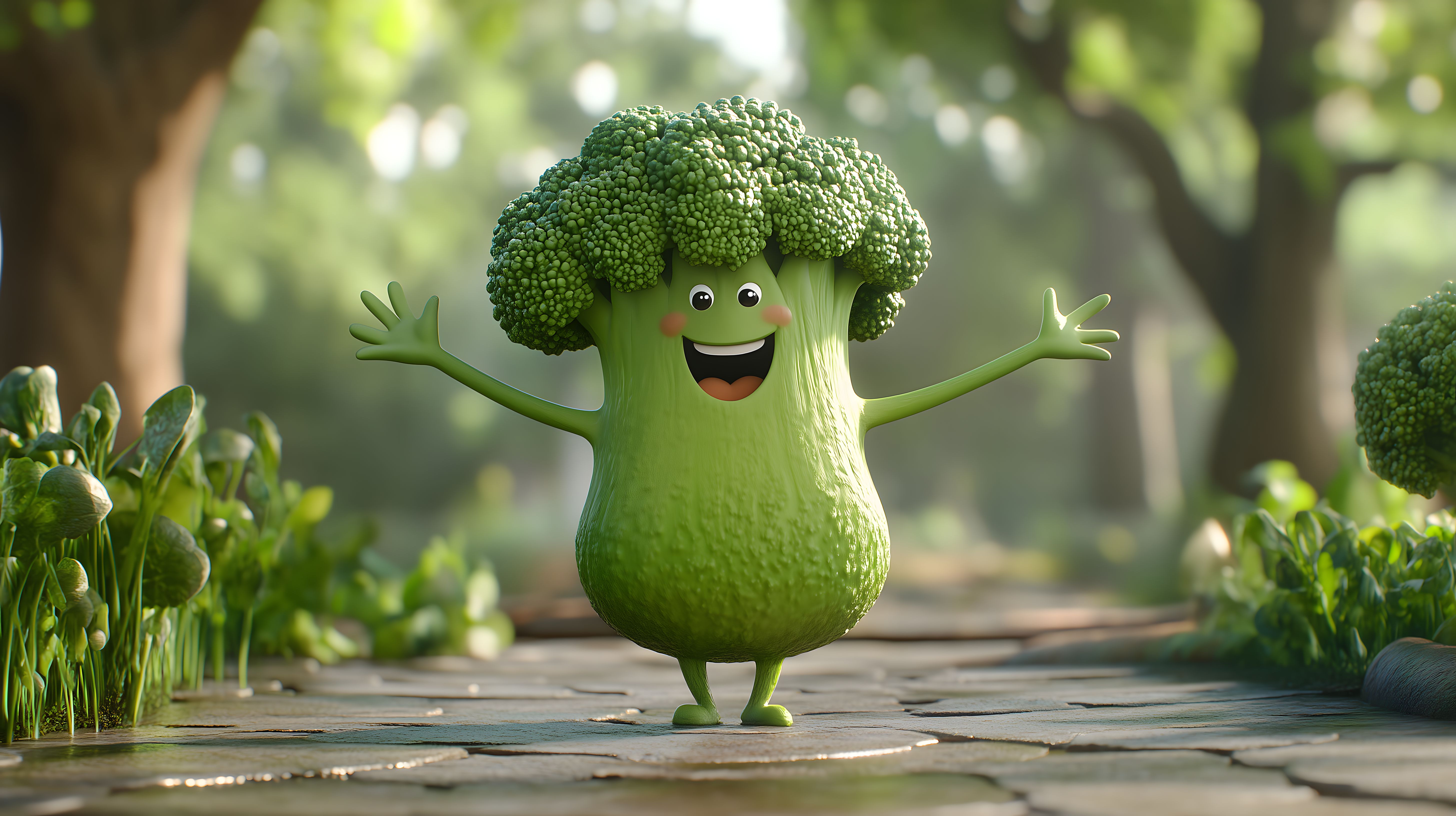 Das Bild zeigt eine lebendige und fröhliche 3D-Cartoon-Darstellung eines Broccoli-Gemüses. Die Figur ist in einem warmen, grünen Farbton gehalten und hat ein breites Lächeln, sowie winkende Arme. Sie steht auf einem Pflasterweg in einer naturnahen Umgebung mit Bäumen und weiteren Gemüsepflanzen im Hintergrund. Die heitere und humorvolle Darstellung des ansonsten oft als trocken wahrgenommenen Broccoli macht das Bild ideal für den Einsatz in Blogs, Newslettern, Social-Media-Posts oder Werbekampagnen zu den Themen gesunde Ernährung, Vegetarismus und Nachhaltigkeit. Das Foto ist in hoher Auflösung verfügbar und kann unter der Creative-Commons-Lizenz kostenfrei verwendet werden.