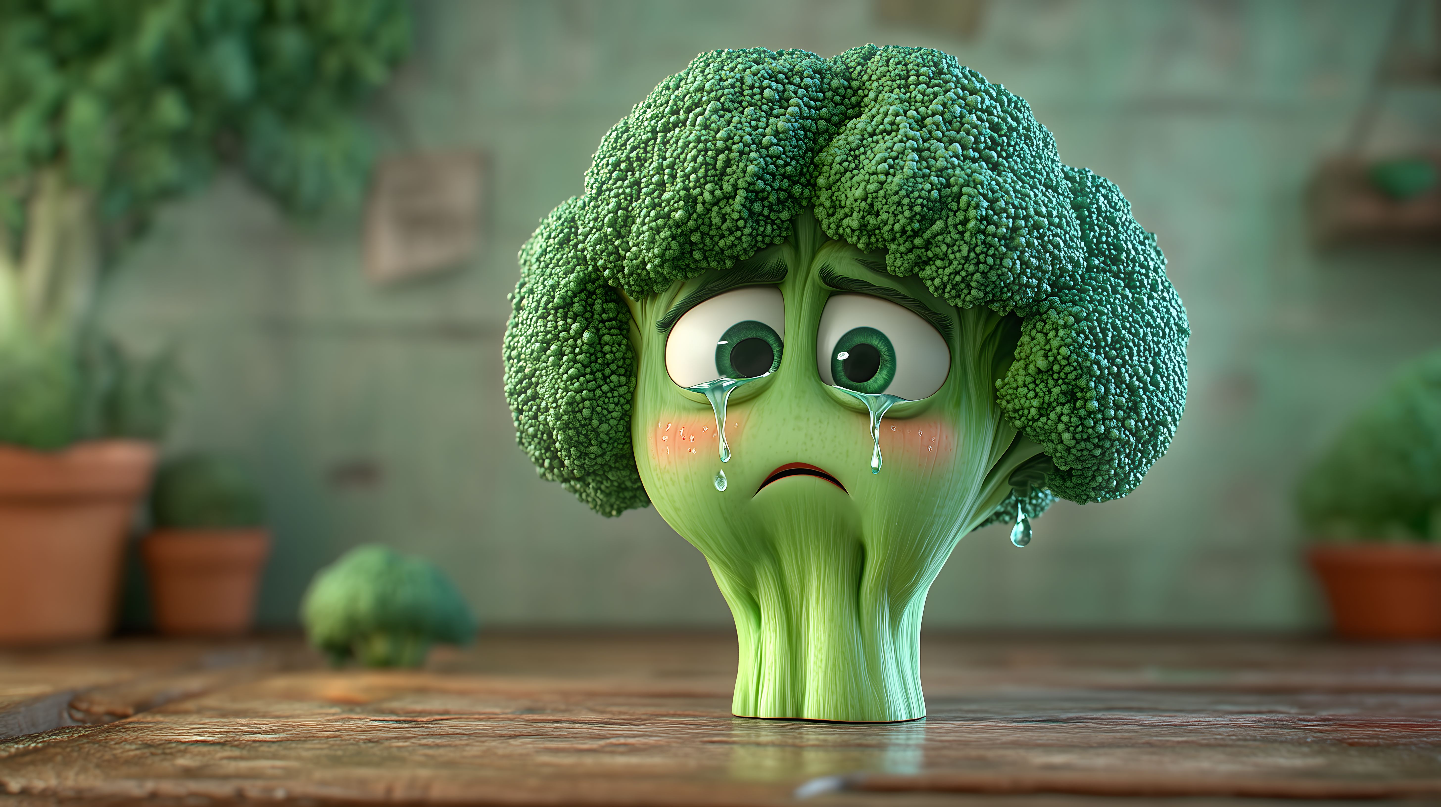 Dieses einzigartige Stockfoto zeigt einen anthropomorphisierten Broccoli mit einem traurigen Gesichtsausdruck. Die detailreiche Nahaufnahme des grünen Gemüses vor einem natürlichen, verschwommenen Hintergrund mit Pflanzen und Holztisch verleiht dem Bild eine heitere, aber auch nachdenkliche Stimmung. Das lustige Konzept eignet sich hervorragend für Verwendungen in Blogs, Newslettern, Social-Media-Posts oder Werbung rund um Themen wie gesunde Ernährung, Vegetarismus, Landwirtschaft oder auch für humorvolle visuelle Konzepte. Das hochauflösende Foto steht unter Creative-Commons-Lizenz zur freien Nutzung zur Verfügung.