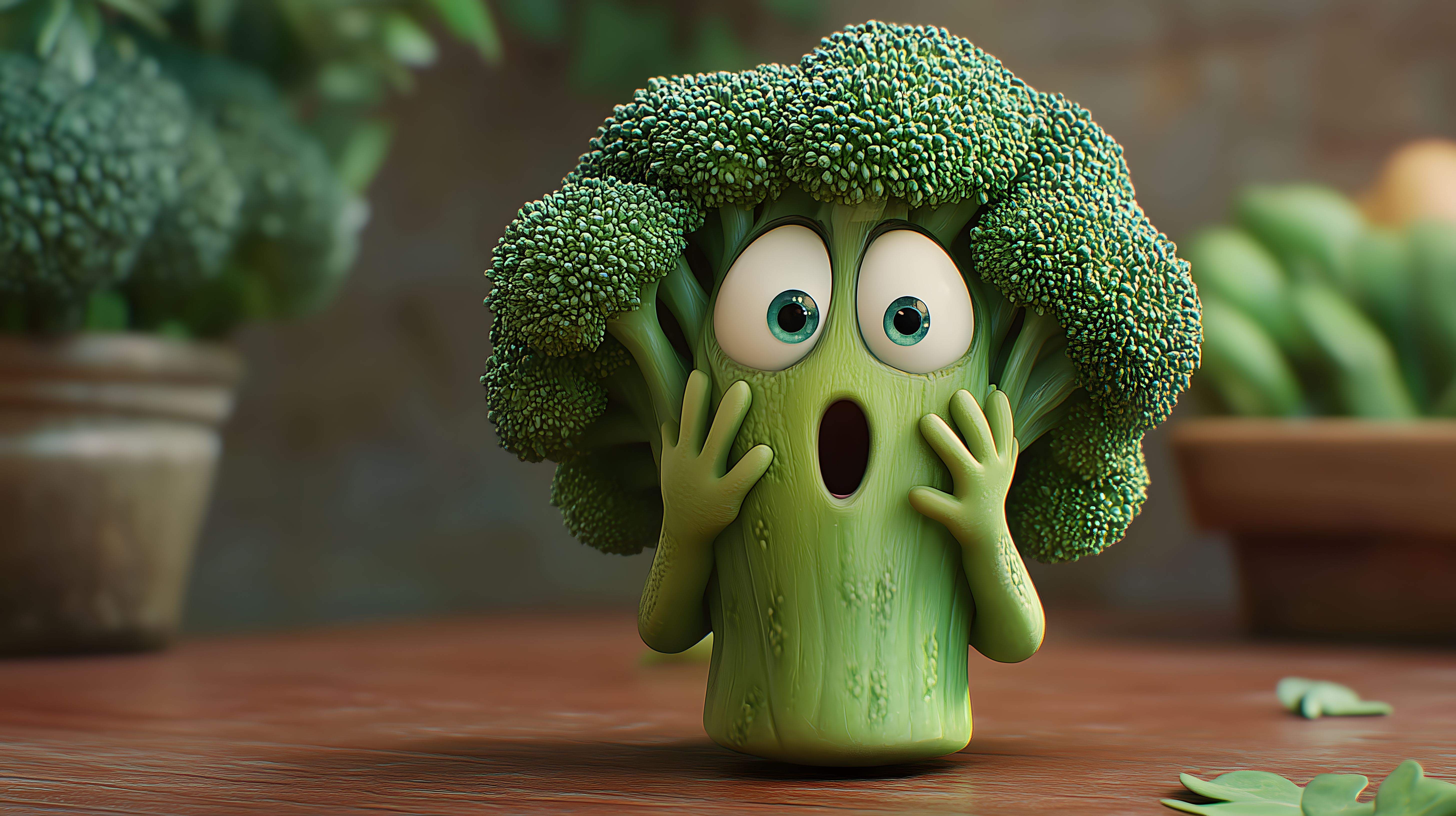 Das Bild zeigt einen anthropomorphischen Brokkoli mit überraschtem Gesichtsausdruck und weit aufgerissenen Augen. Die Hände des Gemüses sind an den Wangen platziert, als wäre es erschrocken. Der Brokkoli ist in Nahaufnahme dargestellt und vor einem unscharfen, grünen Hintergrund zu sehen. Das Foto hat einen humorvollen und skurrilen Charakter und könnte für kreative Projekte in den Bereichen Werbung, Social Media, Blogs oder Newsletter eingesetzt werden. Als kostenloses Stockfoto in hoher Auflösung und unter Creative-Commons-Lizenz ist es für verschiedenste Einsatzzwecke frei verfügbar.