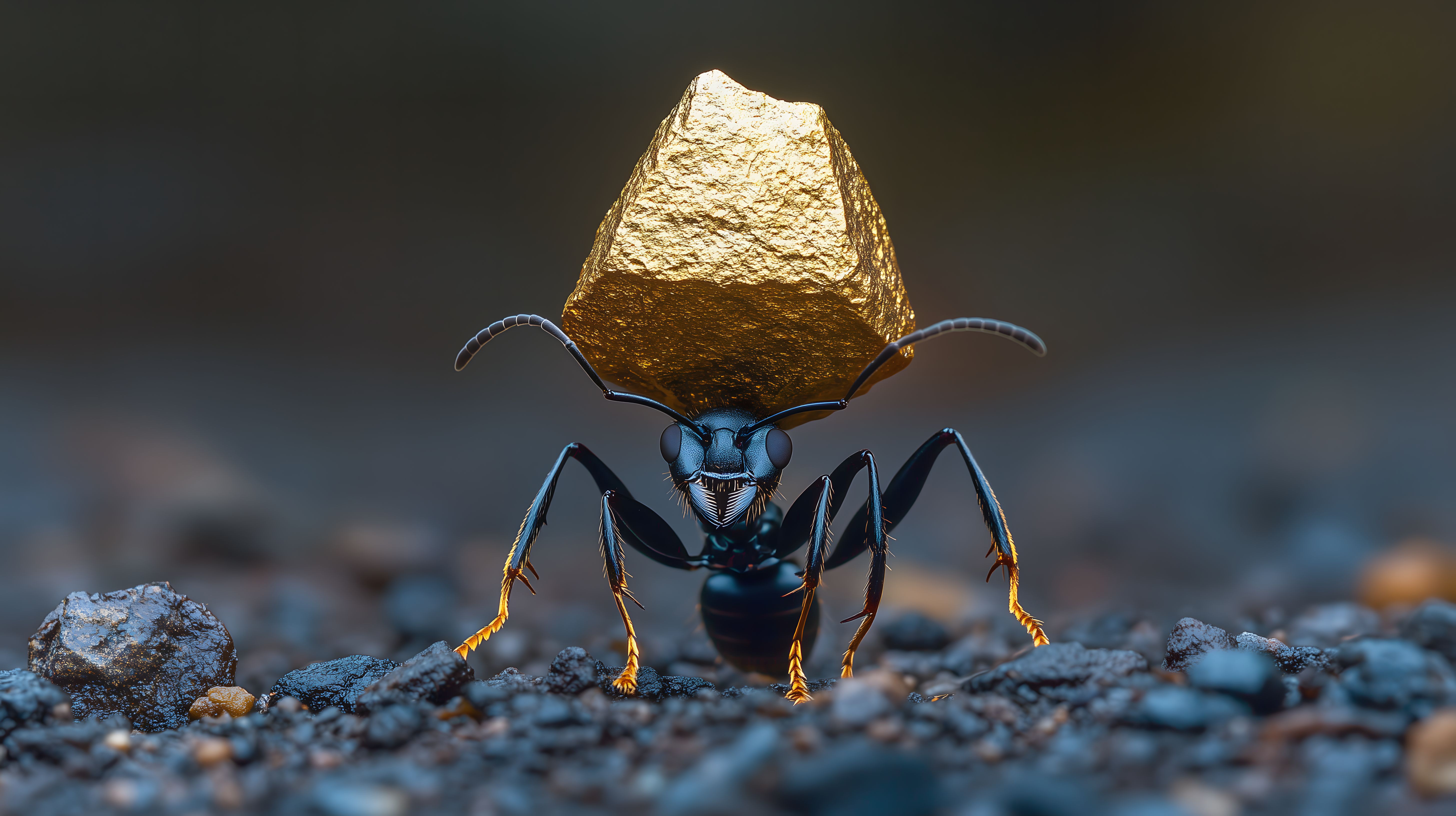 Dieses faszinierende Makrofoto zeigt einen schwarzen Käfer, der einen goldfarbenen Stein auf seinem Rücken trägt. Der Kontrast zwischen dem dunklen Insekt und dem strahlenden Gold erzeugt eine beeindruckende und ungewöhnliche Szene. Die Nahaufnahme lässt Details wie die Augen und Beine des Käfers deutlich hervortreten. Dieses Bild eignet sich hervorragend als einzigartiges und hochwertiges Stockfoto für Projekte wie Blogbeiträge, Social-Media-Posts, Werbematerial oder kreative Designarbeiten. Es ist in hoher Auflösung verfügbar und steht unter einer kostenlosen Creative-Commons-Lizenz zur Verfügung.