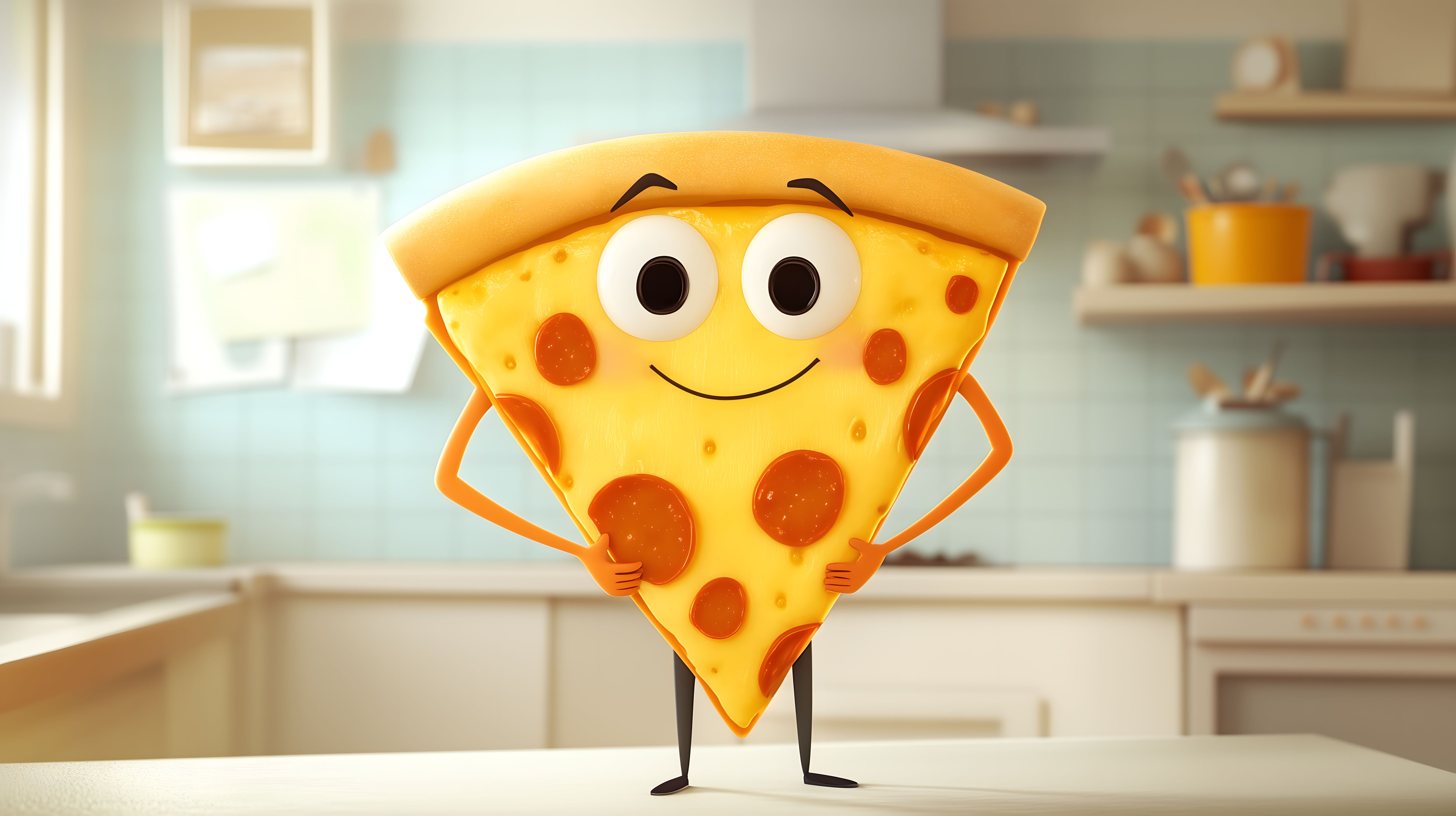 Das Bild zeigt eine lächelnde und stolze Cartoon-Pizza, die mit ausgebreiteten Armen in einer modernen Küche steht. Die Pizza hat ein fröhliches Gesichtsausdruck und scheint sehr zufrieden und selbstbewusst. Der Hintergrund ist hell und freundlich, mit Regalen, Fenster und anderen Küchenutensilien. Dieses Stockfoto eignet sich hervorragend für Kochbücher, Foodblogs, Küchendekorationen oder kreative Werbekampagnen zum Thema Ernährung. Es ist in hoher Auflösung verfügbar und unter einer Creative-Commons-Lizenz kostenlos nutzbar.