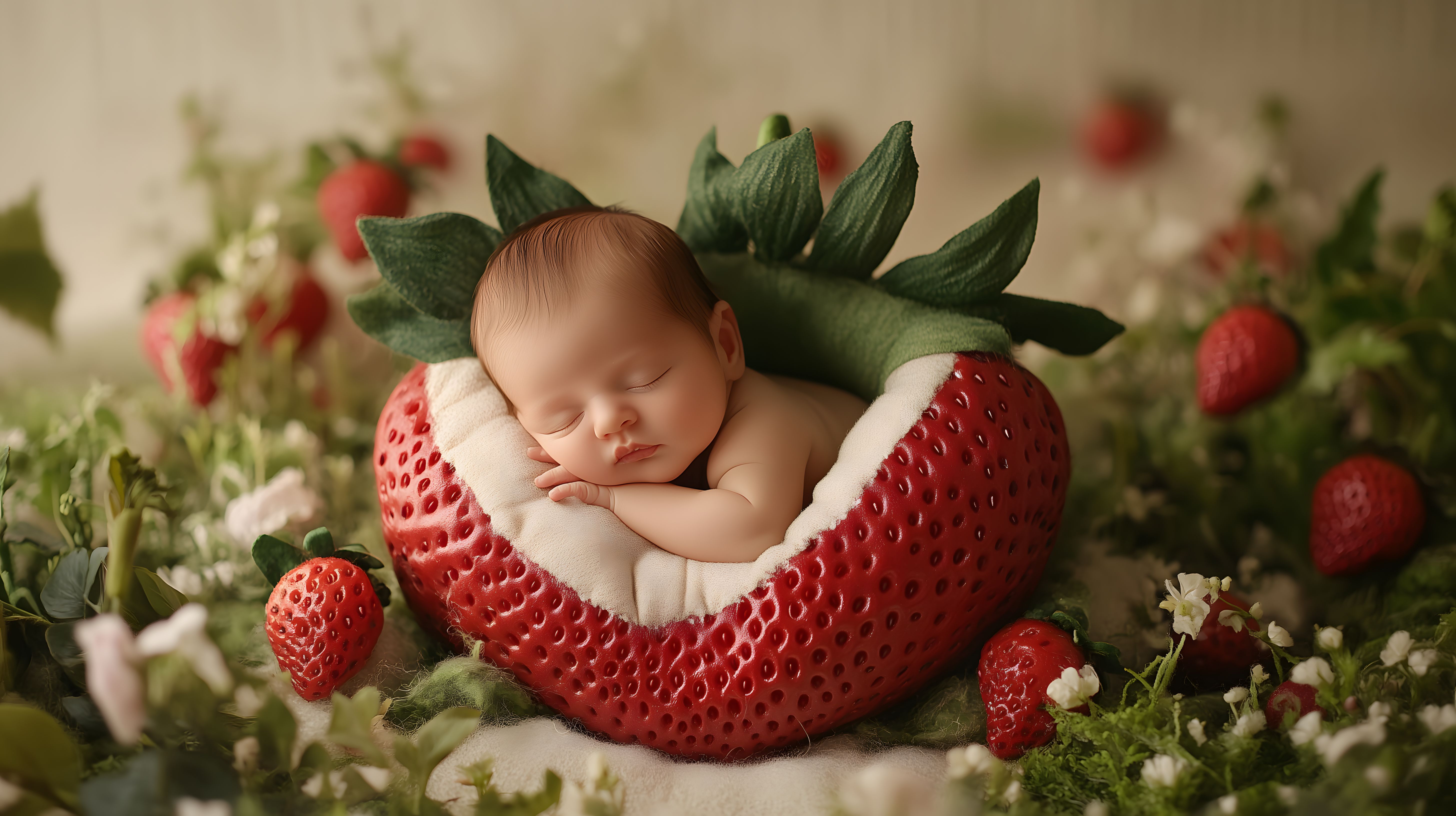 Dieses bezaubernde Foto zeigt ein winziges, friedlich schlafendes Baby, eingebettet in einer roten, erdbeerfömigen Wiege. Das Baby ruht auf einem Blätterbett, umgeben von grünen Blättern und frischen roten Erdbeeren, die die natürliche, organische Szenerie ergänzen. Die Farbpalette in Rot, Grün und Weiß schafft eine warme, gemütliche Stimmung und verleiht dem Bild eine liebevolle, idyllische Ausstrahlung. Dieses Foto eignet sich perfekt als Hintergrund für Babyblogartikel, Babyshower-Einladungen, Kindergrafikdesigns oder zur Verwendung in Werbematerialien für Babyprodukte. Dieses hochauflösende, kostenfrei verfügbare Stockfoto unter Creative-Commons-Lizenz bietet eine natürliche, ansprechende Optik für eine Vielzahl an Einsatzmöglichkeiten.