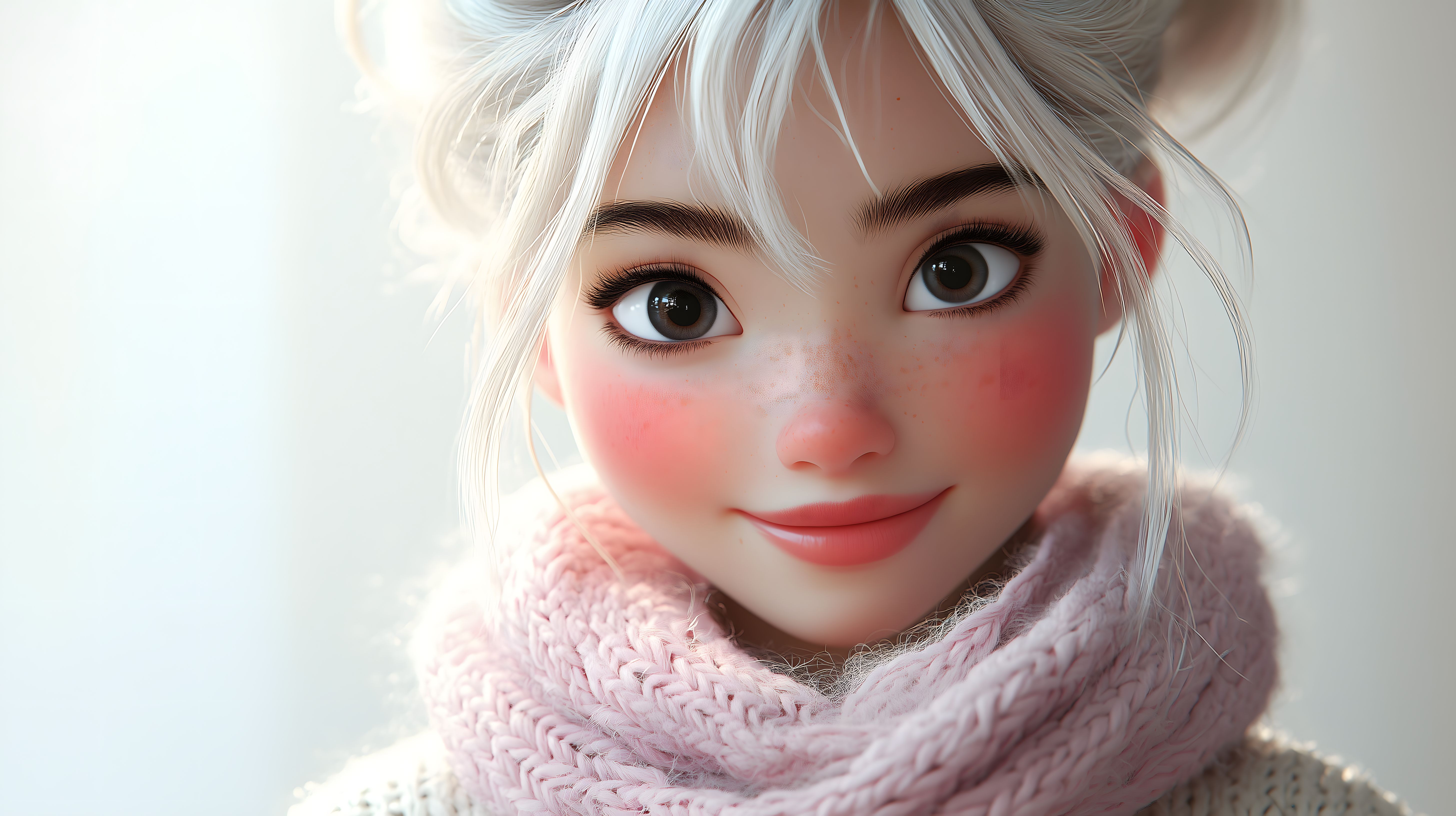 Das Bild zeigt das strahlende Porträt einer jungen Frau mit weißen Haaren, die einen rosa Schal trägt und ein freundliches Lächeln auf dem Gesicht hat. Der Hintergrund ist hell, wodurch der Fokus voll und ganz auf das Gesicht der Figur gelenkt wird. Die Darstellung erinnert an den Stil von Anime-Illustrationen, mit großen, ausdrucksstarken Augen und betont rosigen Wangen.