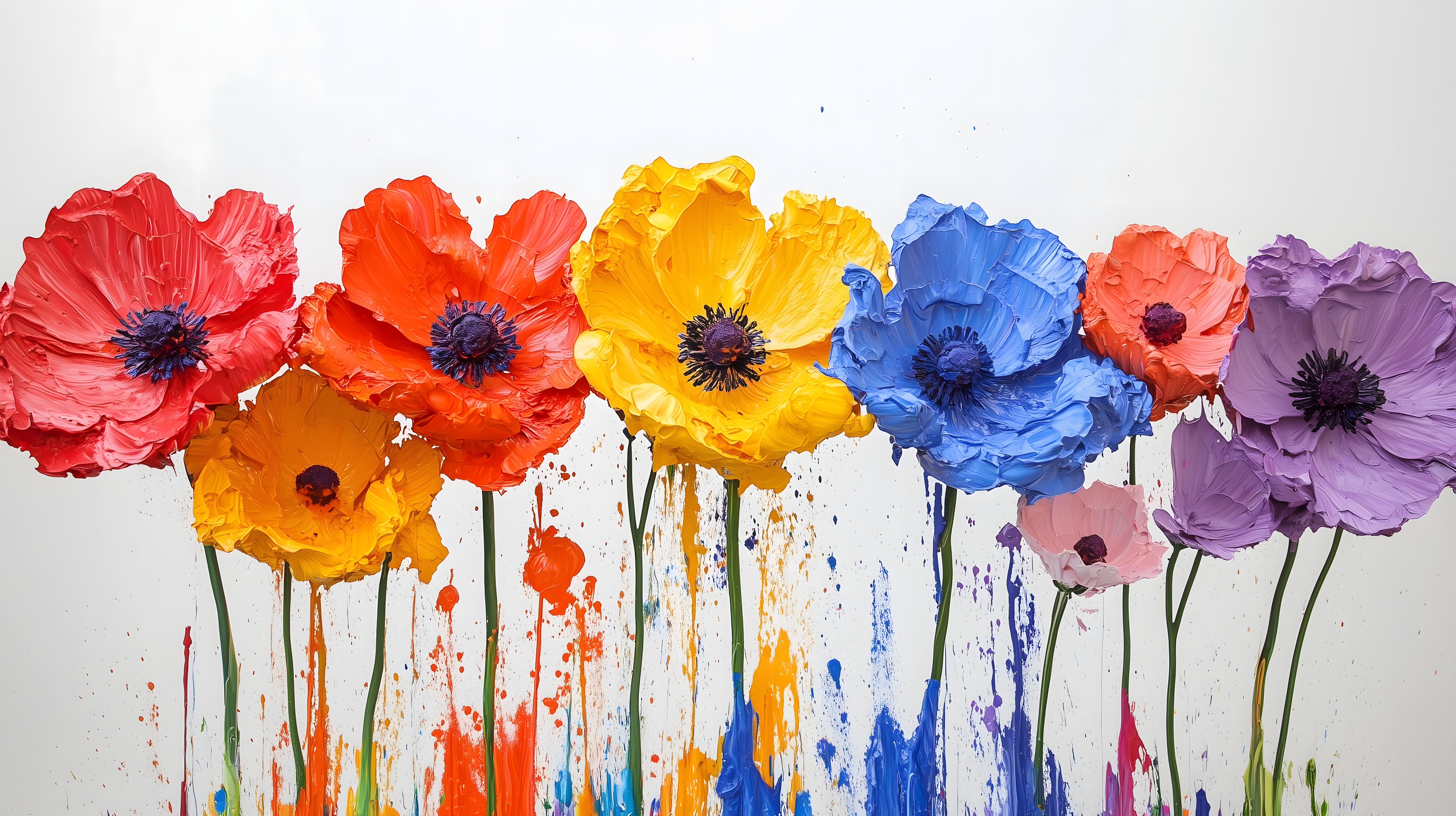 Dieses bunte Gemälde zeigt einen Strauß farbenfroher Blüten, die wie mit dem Pinsel gemalt wirken. Die Mohnblumen in Rot, Orange und Gelb stehen im Kontrast zu den violetten und blauen Akzenten, die einen lebendigen, dynamischen Eindruck vermitteln. Die Komposition erinnert an eine abstrakte Kunstszene, ist aber gleichzeitig fotorealistisch detailliert. Das Bild eignet sich hervorragend als kostenloses Stockfoto für Blogs, Social Media-Posts, Werbung und andere Projekte in hoher Auflösung unter Creative-Commons-Lizenz.