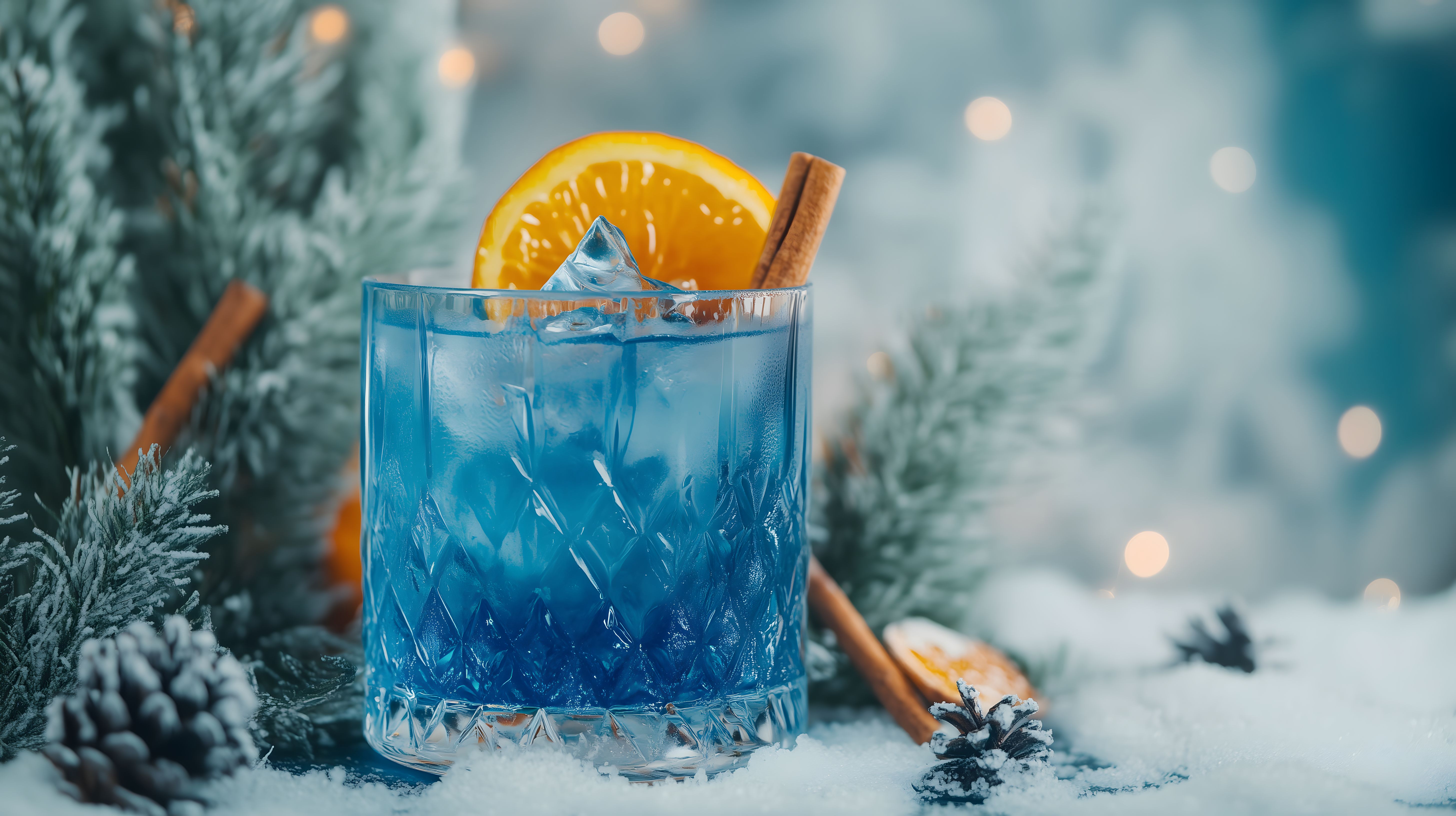 Dieses Foto zeigt einen köstlichen blauen Cocktail, der mit einer frischen Orangenscheibe und einer Zimtstange dekoriert ist. Der Drink steht inmitten einer winterlichen Szenerie mit Tannenzweigen und leichtem Schneefall. Die kristallklare Flüssigkeit, die die Farbigkeit des Glases widerspiegelt, verleiht dem Getränk einen verführerischen Charakter. Dieses stimmungsvolle Stockfoto eignet sich hervorragend für den Einsatz in Blogs, Newslettern, Social-Media-Beiträgen oder Werbekampagnen, die eine festliche, frostige Atmosphäre vermitteln möchten. Das hochauflösende Bild mit seinen klaren Konturen und satten Farben ist unter einer kostenlosen Creative-Commons-Lizenz verfügbar.