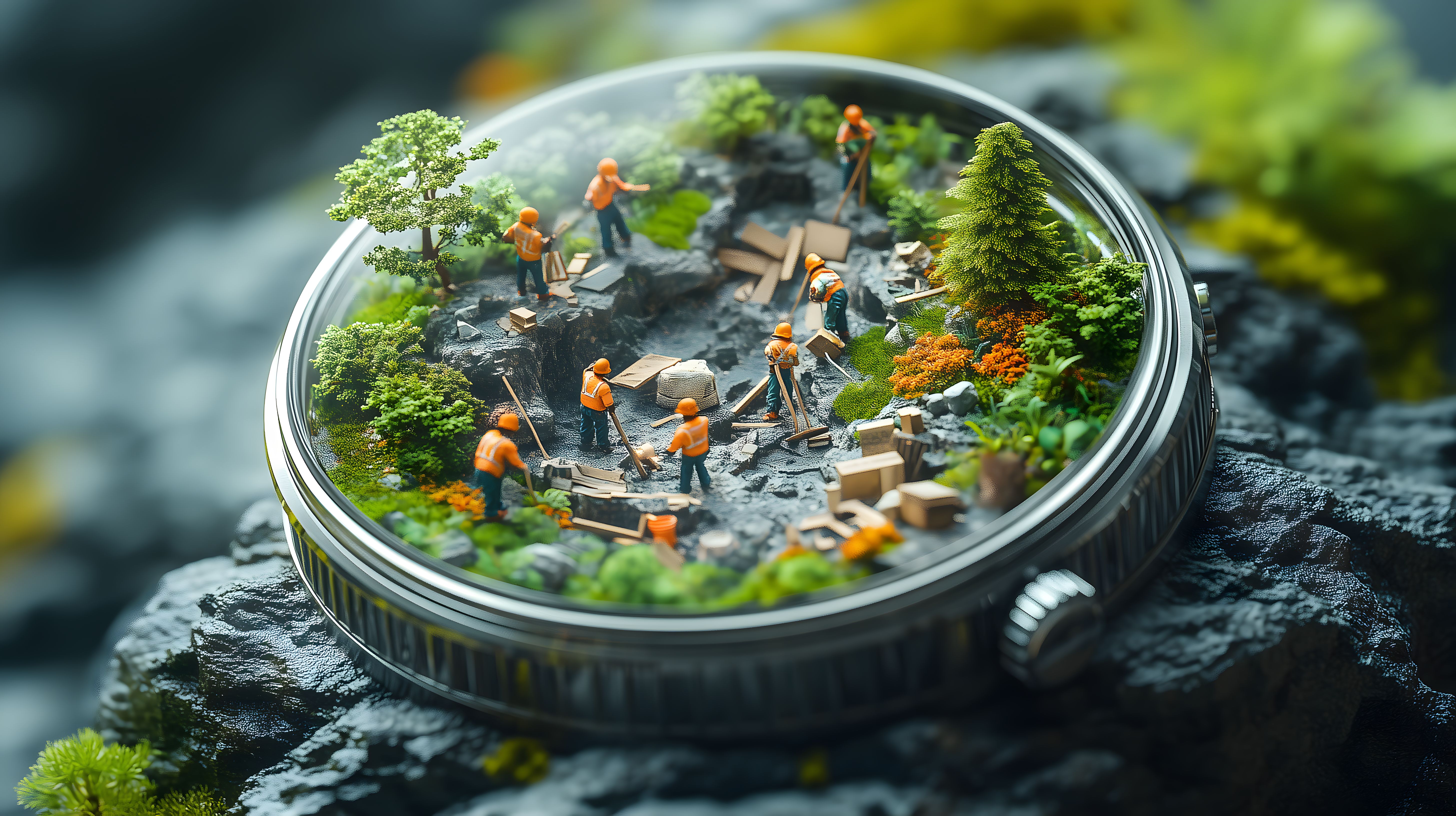 Dieses faszinierende Foto zeigt eine detaillierte Miniatur-Baustelle, die in eine vintage Armbanduhr eingebettet ist. Die Szene ist von einer lebendigen Naturlandschaft umgeben, mit Felsen, Moos, Bäumen und anderen Pflanzen, die eine surreale und kreative Atmosphäre schaffen. Die winzigen Bauarbeiter und ihr Equipment verleihen dem Bild eine realistische und inspirierende Note. Diese außergewöhnliche Komposition lädt dazu ein, die Fantasie zu beflügeln und über die Verbindung von Natur, Technik und menschlicher Arbeit nachzudenken. Als kostenloses Stockfoto in hoher Auflösung und unter einer Creative Commons-Lizenz ist dieses Bild ideal für den Einsatz in Blogs, Newsletters, sozialen Medien oder Werbekampagnen.