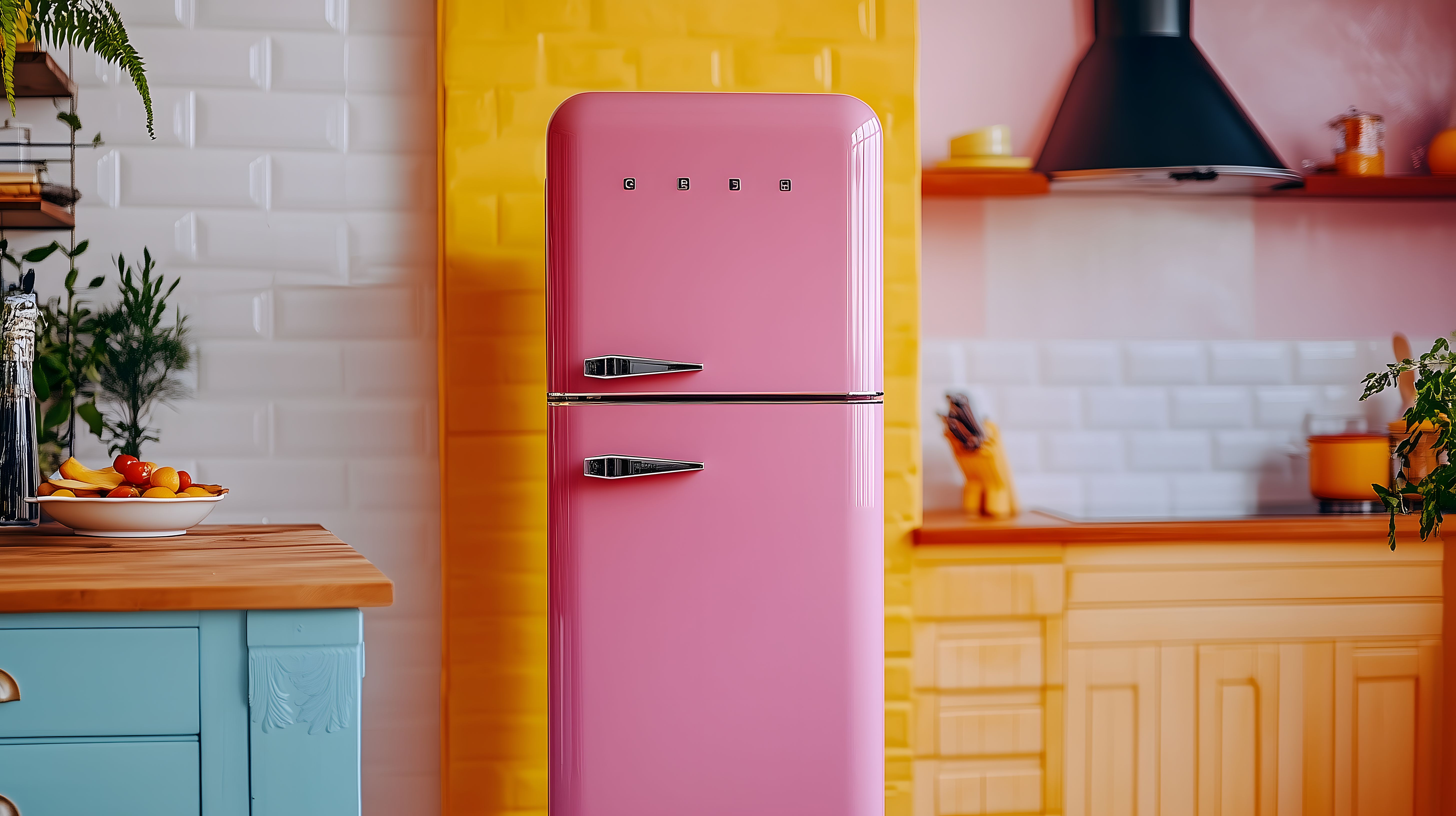 Das Foto zeigt einen auffallend rosa Retro-Kühlschrank, der sich perfekt in die farbenfrohe Küchenszene einfügt. Der markante Kühlschrankdesign im Vintage-Stil ist ein echter Hingucker und verleiht dem Raum einen modernen und stimmungsvollen Charakter. Um den Kühlschrank herum sehen wir weitere Küchenelemente wie Regale, Arbeitsplatten und Dekoartikel, die die warmen Gelb- und Orangetöne des Raums betonen. Die Kombination aus dem Retro-Kühlschrank, den frischen Früchten und Gemüsen sowie den grünen Pflanzen schafft eine einladende und lebendige Atmosphäre, die ideal für Foodfotografie, Werbung oder Interior-Konzepte geeignet wäre. Dieses hochauflösende Stockfoto steht unter einer Creative Commons-Lizenz zur kostenlosen Verwendung zur Verfügung.