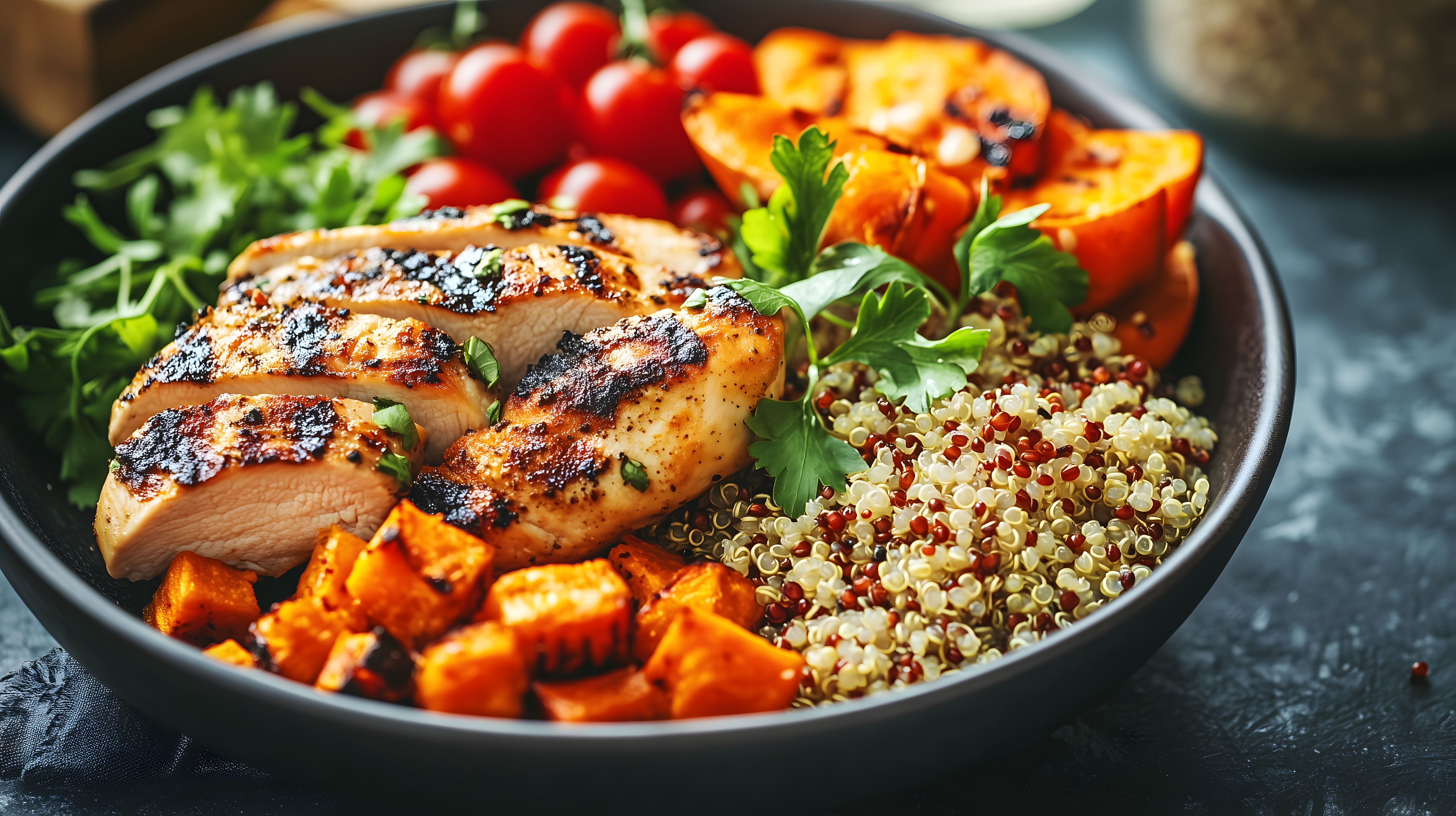 Dieses Foto zeigt einen appetitlich angerichteten Teller mit einem abwechslungsreichen, gesunden Mittagessen. Zu sehen sind gegrillte Hähnchenstücke, Quinoa, geröstete Süßkartoffeln und frisch gewaschene Tomaten. Das Ganze ist in einer rustikalen, dunklen Schüssel angerichtet und mit grünen Blättern garniert, was dem Gericht eine natürliche, wohnliche Optik verleiht.