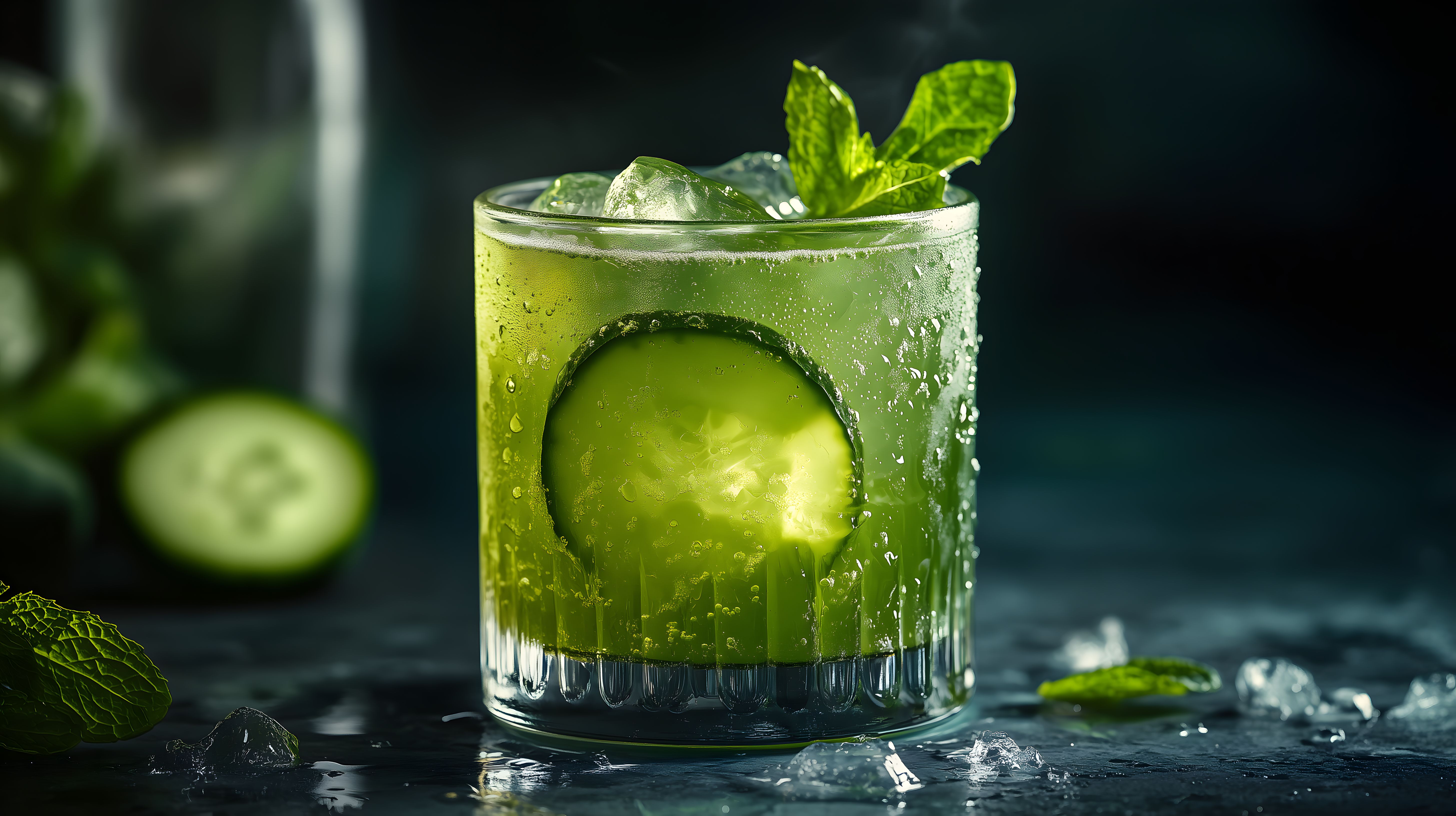 Dieses Foto zeigt ein erfrischendes Gurken-Minz-Getränk in einem Glas. Das Getränk ist mit Eiswürfeln und Minzblättern dekoriert, was den kühlen und erfrischenden Charakter unterstreicht. Die leuchtend grüne Farbe des Getränks und die Wassertropfen am Glas verleihen dem Bild eine sommerliche und einladende Atmosphäre.