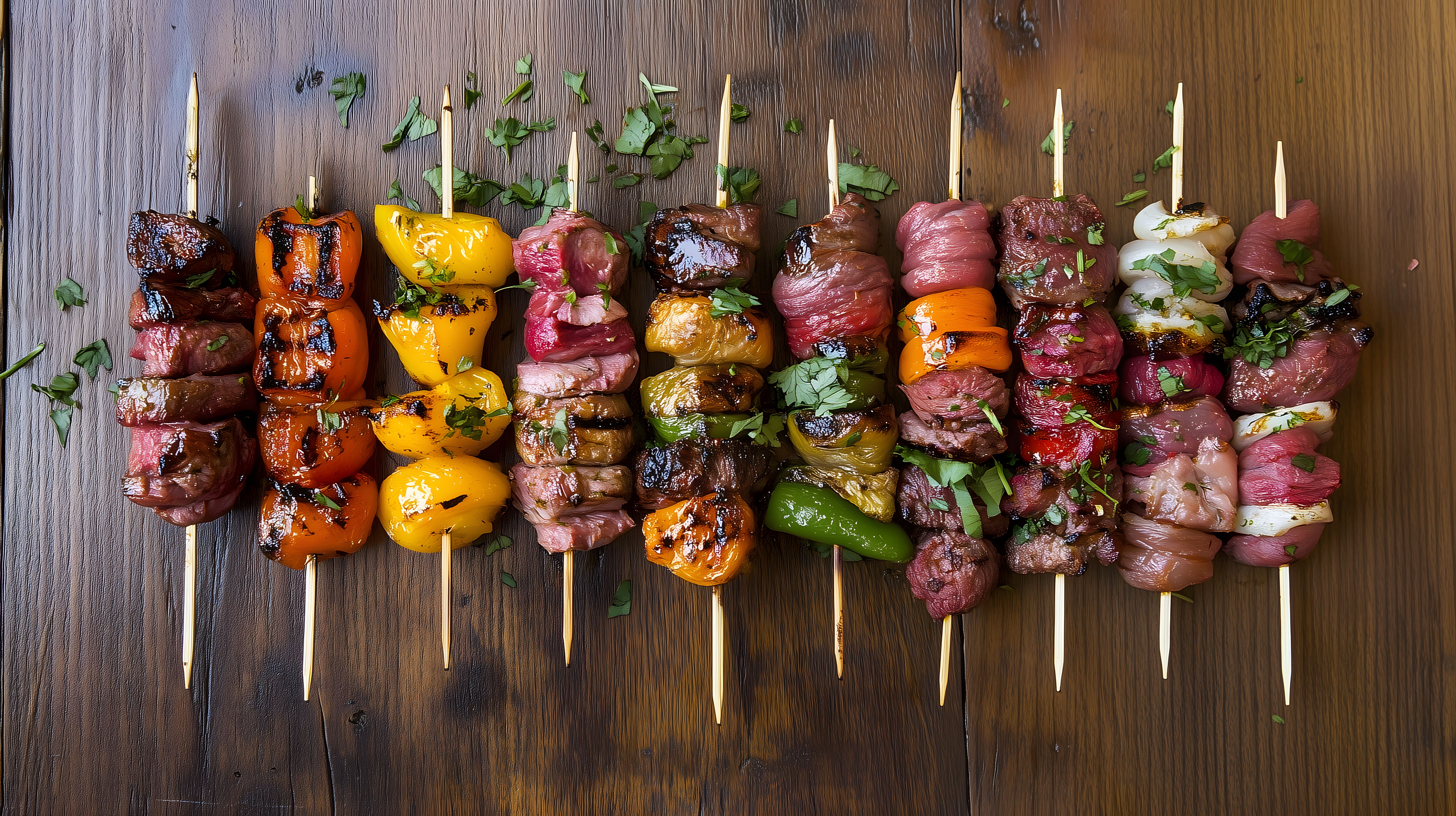 Das Bild zeigt eine Reihe von deliziösen Fleischspießen, die mit farbigem, gegrilltem Gemüse wie Paprika, Zwiebeln und Kräutern garniert sind. Die Spieße sind auf einem rustikalen Holztisch angerichtet, was der Szene einen natürlichen und appetitlichen Charakter verleiht. Diese Aufnahme eignet sich perfekt als kostenloses Stockfoto für Rezept-Blogs, Social-Media-Beiträge zur Grillsaison, Werbeanzeigen für Restaurants oder Cateringunternehmen sowie weitere Anwendungen in hoher Auflösung und unter der Creative-Commons-Lizenz.