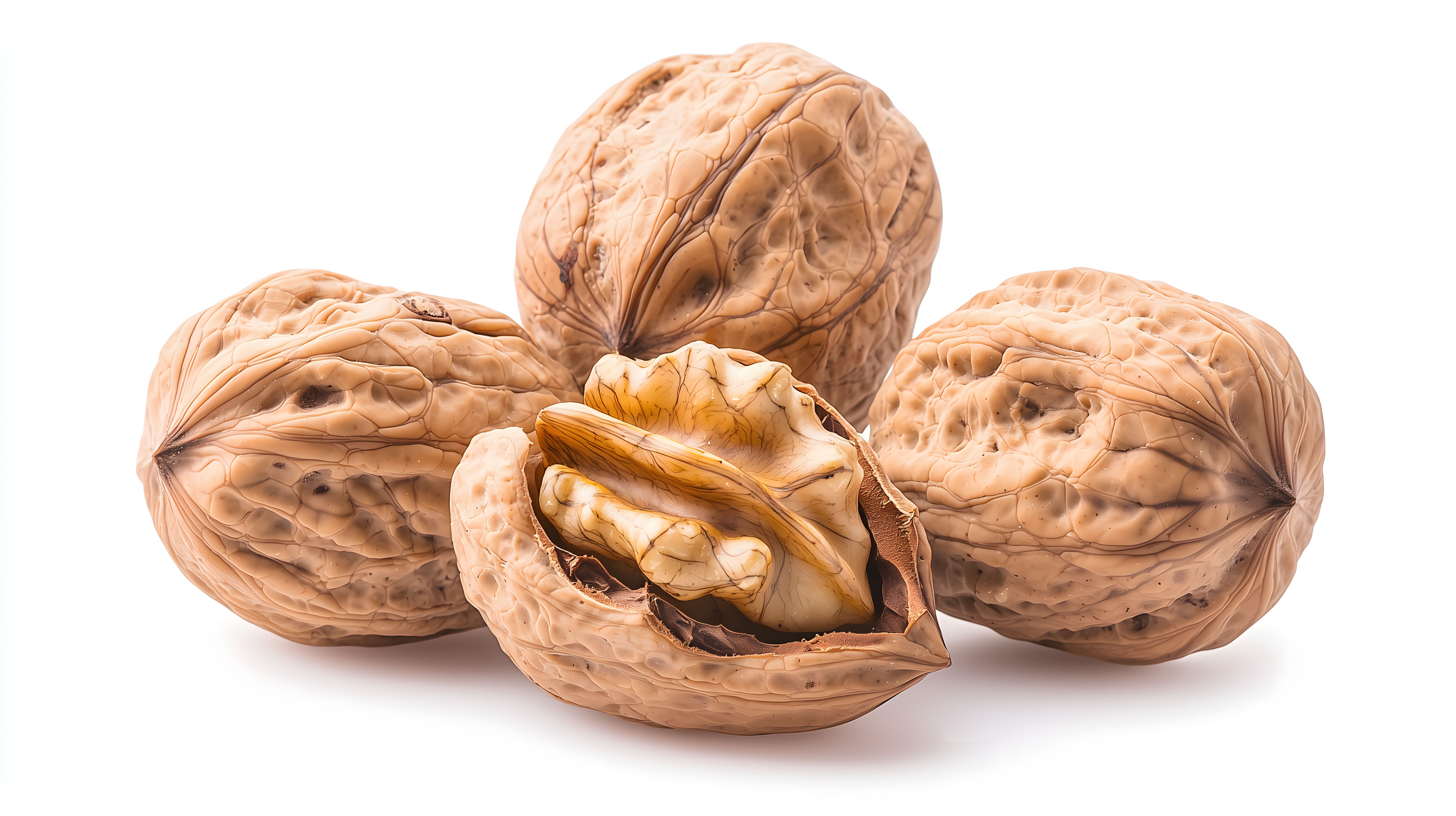 Das Bild zeigt eine Nahaufnahme von Walnüssen auf einem weißen Hintergrund. Die braunen, runzeligen Nussschalen sind deutlich zu erkennen, ebenso die helleren Kerne im Inneren. Die Walnüsse sind ansprechend und appetitlich in Szene gesetzt, sodass dieses Foto perfekt für den Einsatz in Rezepten, Lebensmittel-Blogbeiträgen oder Werbematerialien für gesunde Snacks geeignet ist. Das hochauflösende Bild ist als kostenloses Stockfoto unter Creative-Commons-Lizenz verfügbar.