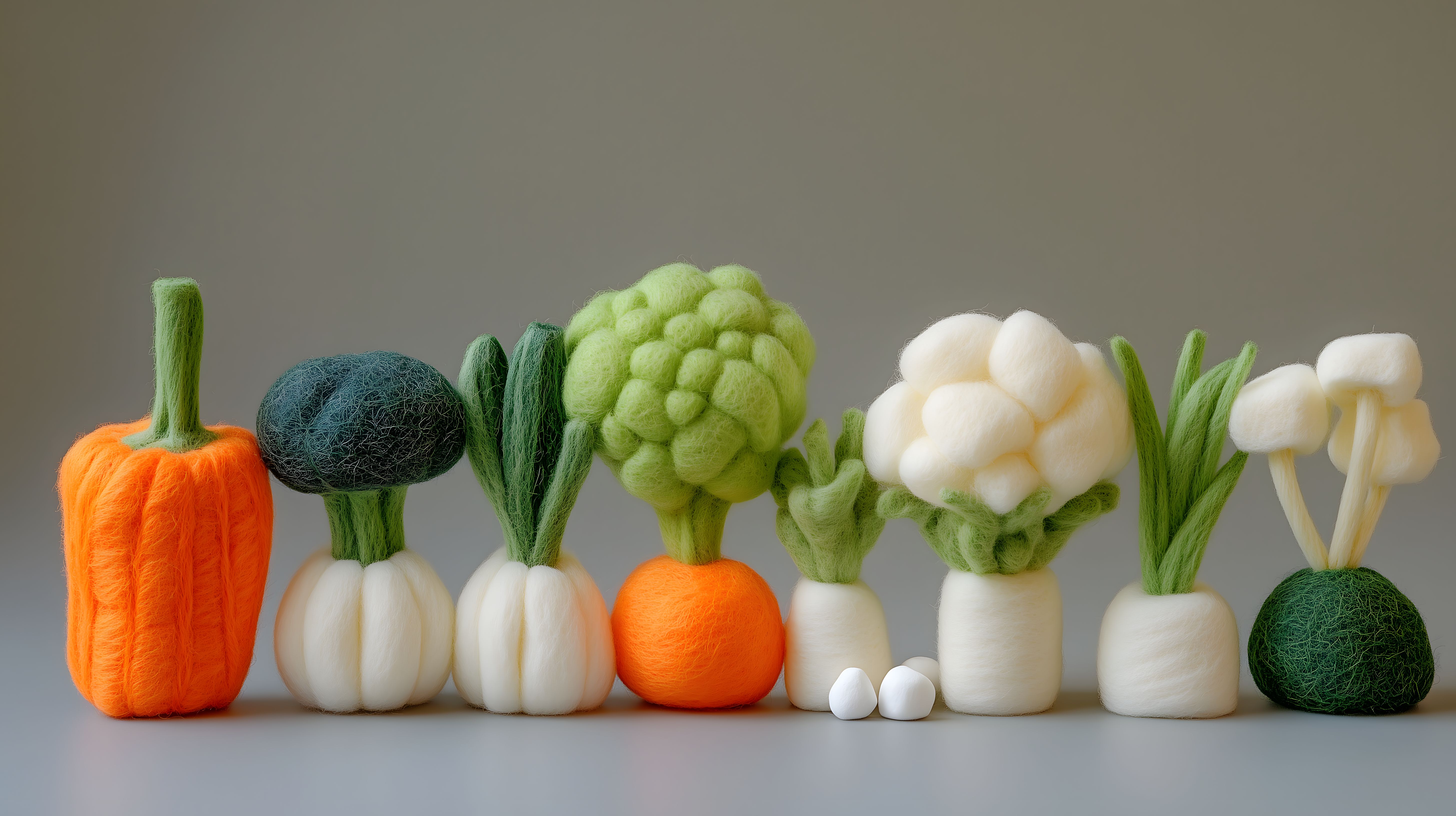 Dieses Foto zeigt eine kreative Anordnung von verschiedenen Gemüse-Filzskulpturen in leuchtenden Farben und unterschiedlichen Formen. Zu sehen sind handgefertigte Filzreproduktionen von Möhren, Avocados, Blumenkohl, Kartoffeln und anderen Gemüsesorten, die sich zu einem stimmungsvollen Still-Leben zusammenfügen. Die detailreiche Gestaltung und die lebendigen Farben machen dieses Motiv zu einem idealen kostenlosen Stockfoto für Blog-Beiträge, Newsletter oder Social-Media-Posts rund um Themen wie Kochen, gesunde Ernährung, Kunsthandwerk oder Dekoration. Das hochauflösende Bild ist unter einer Creative-Commons-Lizenz frei verwendbar.