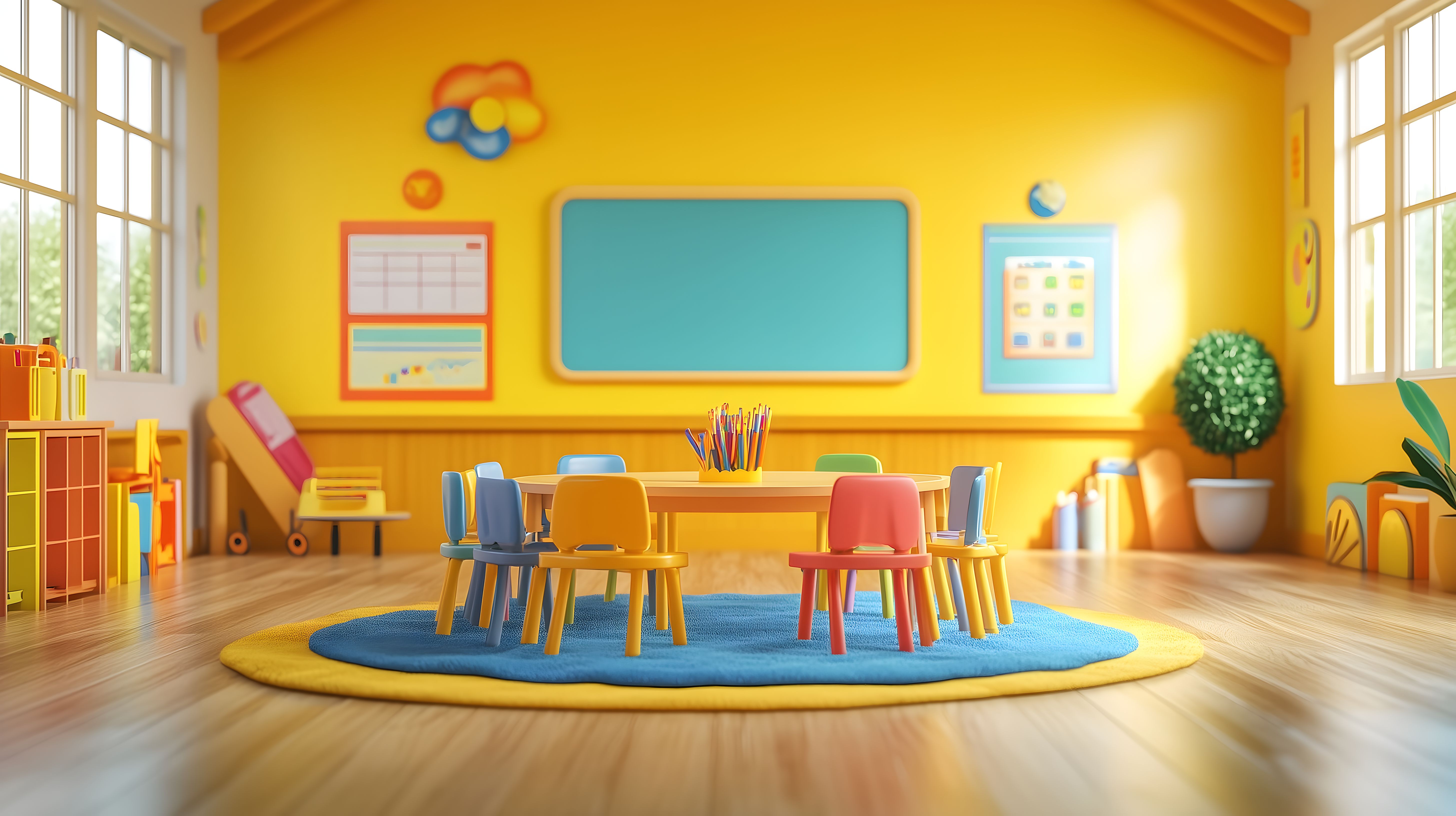 Das Foto zeigt einen hellen, farbenfroh gestalteten Klassenraum. Der Raum ist in einem warmen Gelb gestrichen und mit bunten, kinderfreundlichen Möbeln wie Stühlen und Tischen ausgestattet. An den Wänden hängen Wandbilder und Dekorationen, die eine spielerische und kreative Lernumgebung vermitteln. In der Mitte des Raums befindet sich ein runder, bunter Teppich, der den Raum einladend und gemütlich erscheinen lässt. Insgesamt vermittelt das Foto eine fröhliche und anregende Atmosphäre, die für Grundschulen oder Kindergärten ideal geeignet wäre. Das hochauflösende Stockfoto ist unter einer Creative-Commons-Lizenz frei verfügbar und kann in verschiedenen Kontexten, wie Blogs, Newslettern oder Werbematerialien, eingesetzt werden.