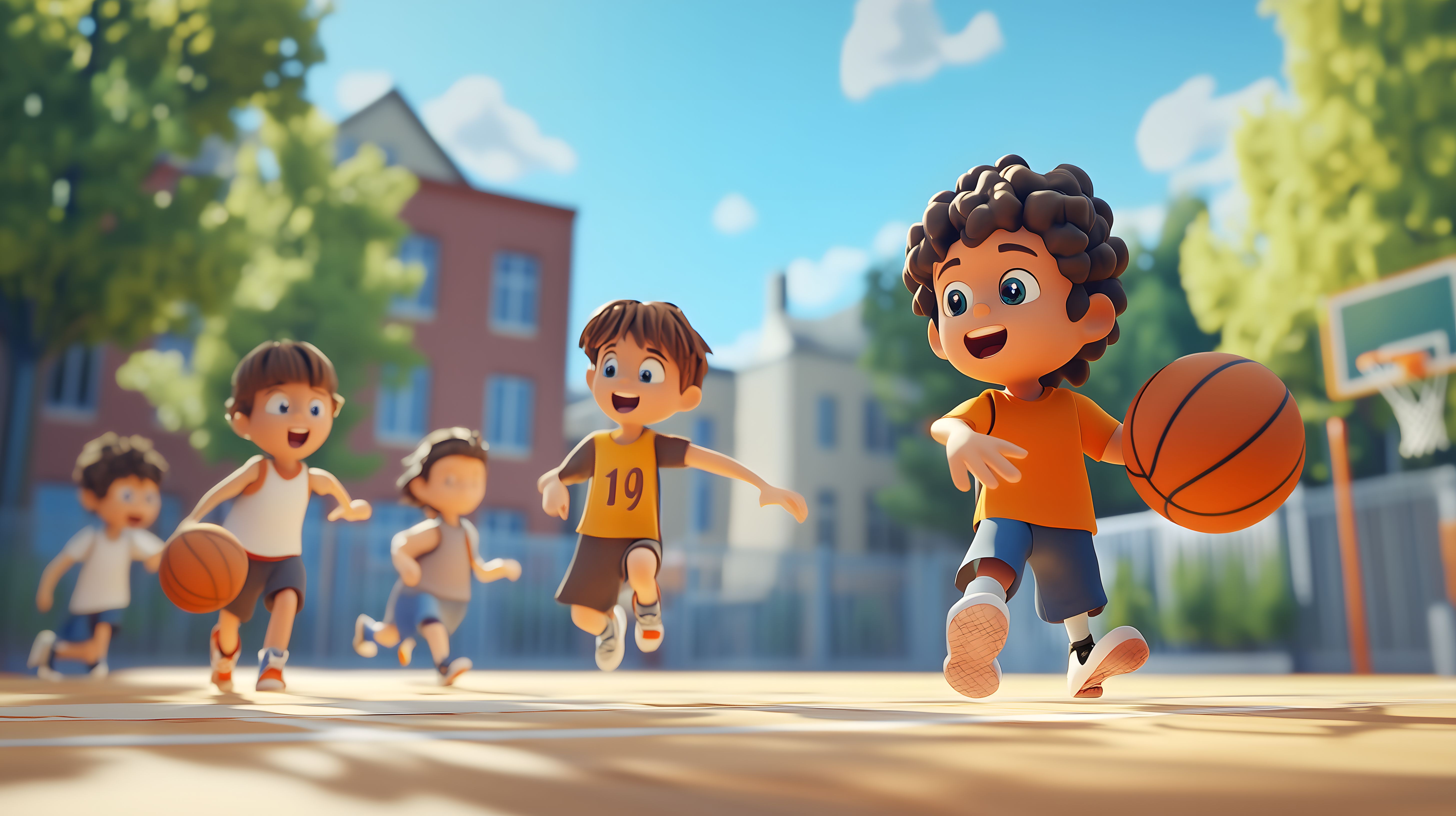 Das Bild zeigt eine Gruppe von fröhlichen Kindern, die Basketballspielen auf einem sonnigen Pausenhof. Die Kinder sind in einem cartoon-artigen Stil dargestellt, mit lebendigen Farben und ausdrucksstarken Gesichtern. Sie laufen, springen und passen den Ball hin und her, während ein blauer Himmel mit weißen Wolken und grünen Bäumen im Hintergrund zu sehen ist. Das Bild vermittelt eine Atmosphäre von Spaß, Bewegung und Freude am gemeinsamen Spiel. Es eignet sich hervorragend als kostenloses Stockfoto für die Verwendung in Blogs, Newslettern, Social-Media-Kanälen oder Werbematerialien zum Thema Schule, Freizeit, Sport oder Kindheit. Die hochwertige Illustration ist in hoher Auflösung verfügbar und unter einer Creative-Commons-Lizenz nutzbar.