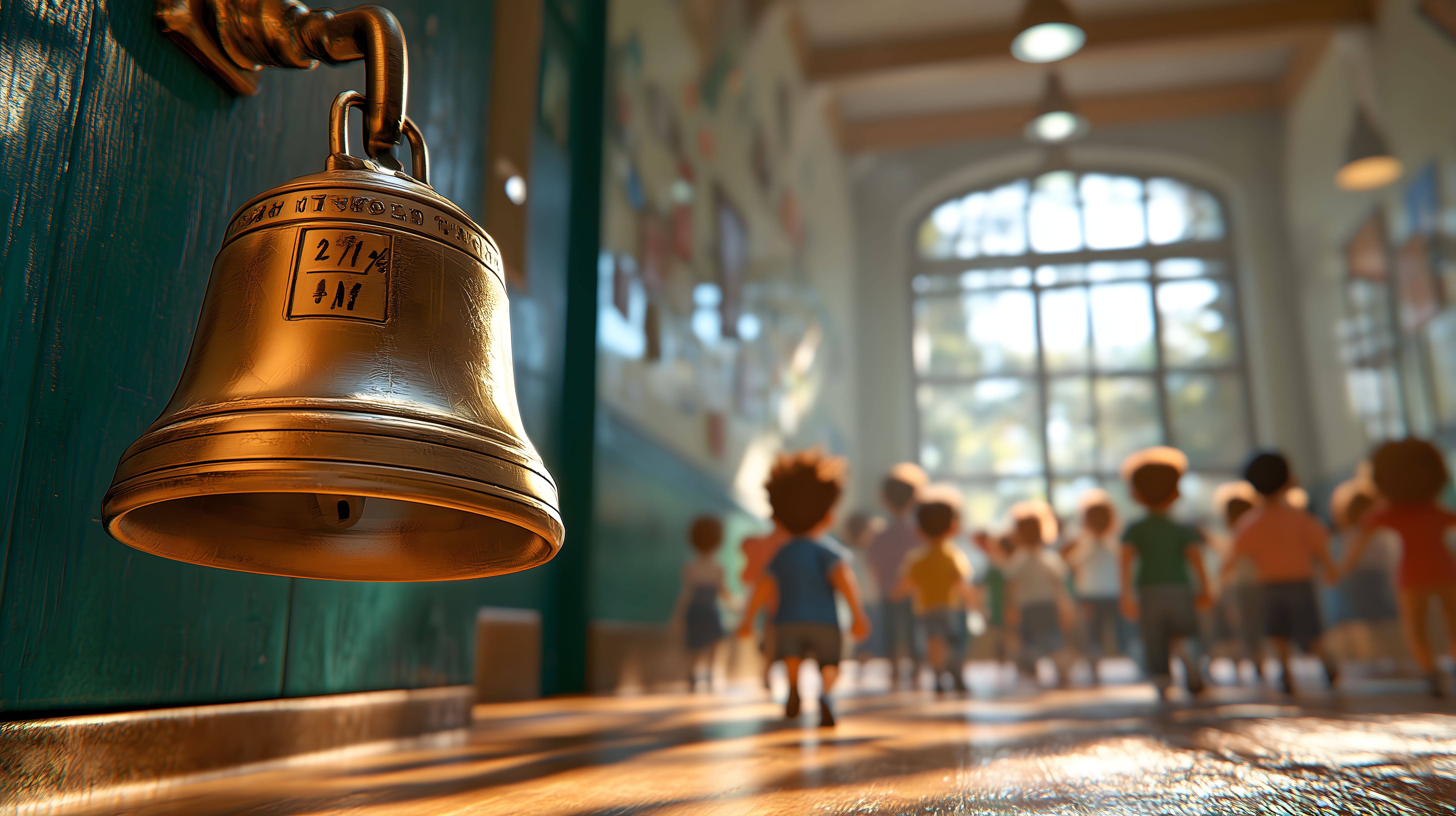 Das Bild zeigt eine Szene in einem historischen Schulgebäude, wo gerade die Schulglocke ertönt und die Schüler den Klassenraum verlassen. Im Vordergrund ist eine goldene, antike Glocke zu sehen, die die Pause oder das Ende des Unterrichts ankündigt. Im Hintergrund sind mehrere Kinder zu erkennen, die den Raum verlassen und in die Freizeit stürmen. Das Licht fällt durch die großen, bogigen Fenster und taucht den Raum in ein warmes, einladendes Licht. Dieses Bild eignet sich hervorragend als kostenloses Stockfoto für Beiträge zum Thema Schule, Bildung, Lernen oder Freizeit von Kindern. Es ist in hoher Auflösung verfügbar und unter einer Creative-Commons-Lizenz nutzbar.