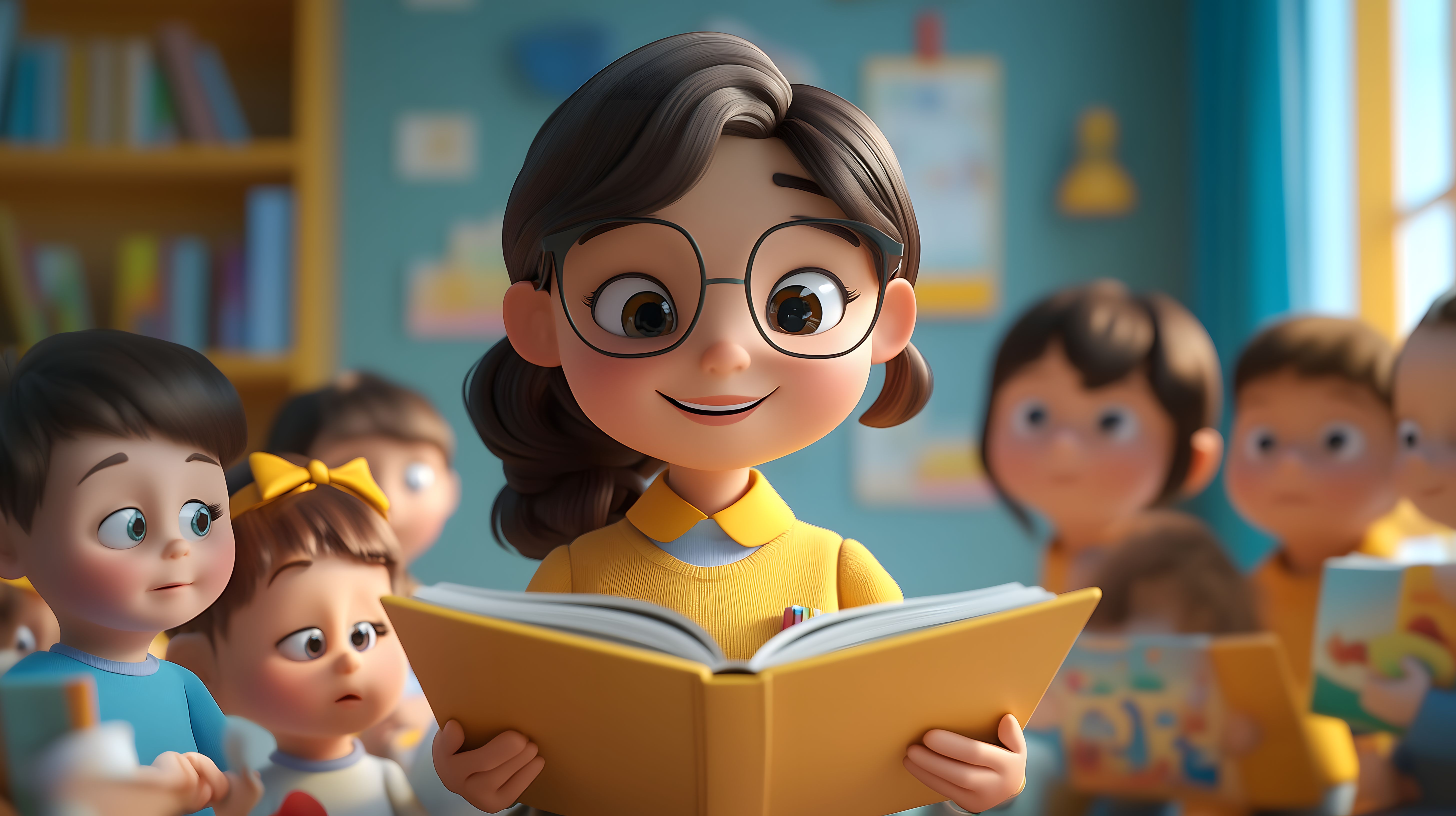 Dieses farbenfrohe Cartoon-Bild zeigt eine Lehrerin, die einer Gruppe von Kindern in einem liebevoll gestalteten Klassenzimmer eine Geschichte vorliest. Die Illustration strahlt Kreativität, Fantasie und den Zauber des Geschichtenerzählens aus. Die Kinder sitzen gebannt um ihre Lehrerin herum, die mit einem fröhlichen Gesichtsausdruck in einem gelben Pullover das offene Buch in ihren Händen hält. Die Szene vermittelt eine einladende, inspirierende Lernatmosphäre, die für viele Einsatzbereiche wie Blogs, Newsletter oder Werbematerial rund um Bildung, Schule und Kindheit geeignet ist. Dieses hochauflösende, kostenlose Stockfoto ist unter Creative Commons-Lizenz frei nutzbar.