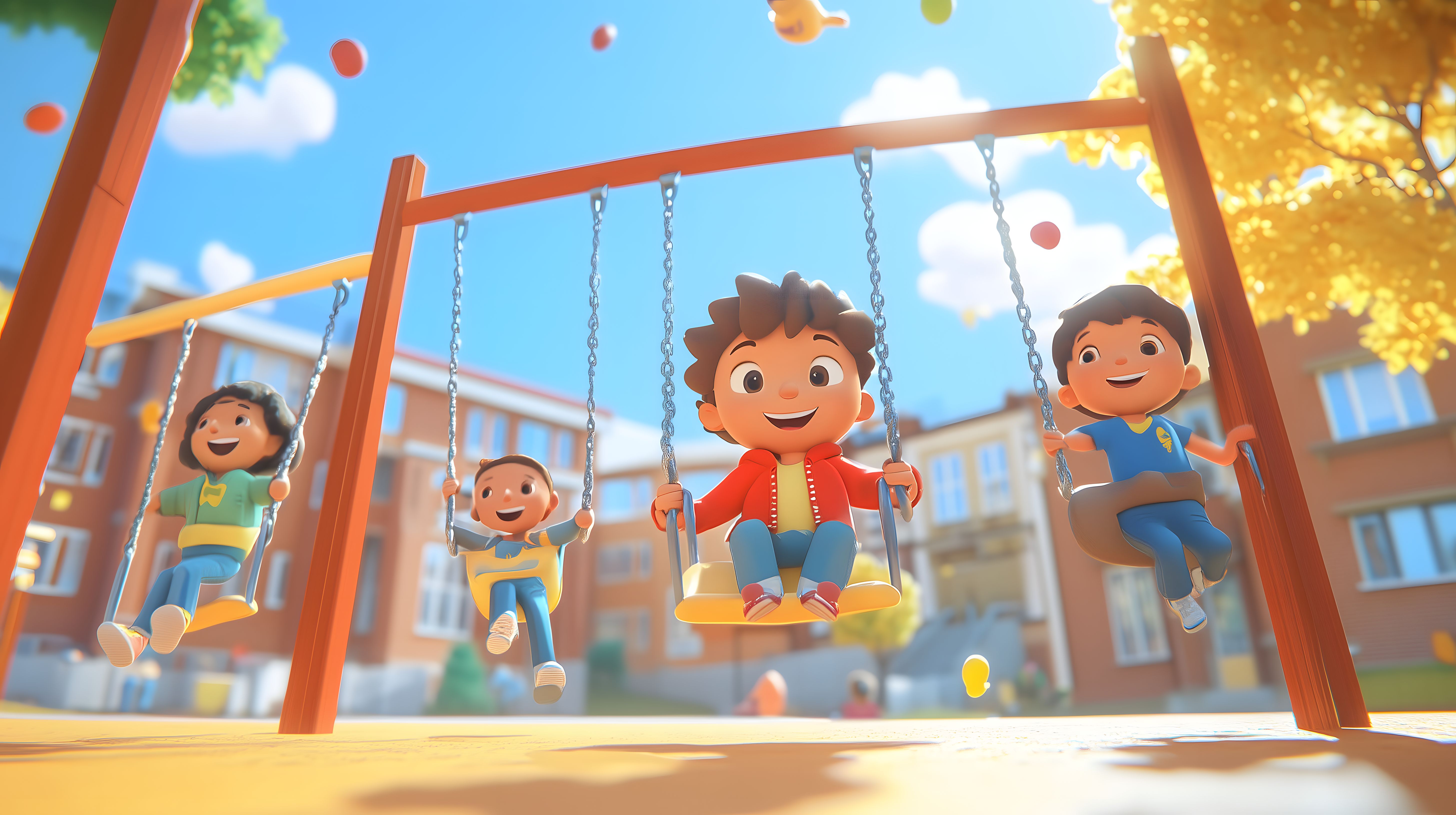 Das Bild zeigt eine fröhliche und lebendige Szene auf dem Schulhof. Mehrere Kinder in bunten Cartoon-Zeichnungen spielen und schaukeln auf den Spielgeräten. Das Bild vermittelt einen Eindruck von Lebensfreude, Bewegung und Spaß in der Kinderecke des Pausenhofs. Mit den strahlenden Farben, der detaillierten Gestaltung und der einladenden Perspektive eignet sich das Foto hervorragend für den Einsatz in Blogs, Newslettern, Social-Media-Beiträgen oder Werbematerialien zum Thema Kinder, Schule, Freizeit oder Bildung. Als kostenfreies Stockfoto in hoher Auflösung und unter Creative-Commons-Lizenz können Unternehmen und Privatpersonen das Bild ohne Einschränkungen nutzen.