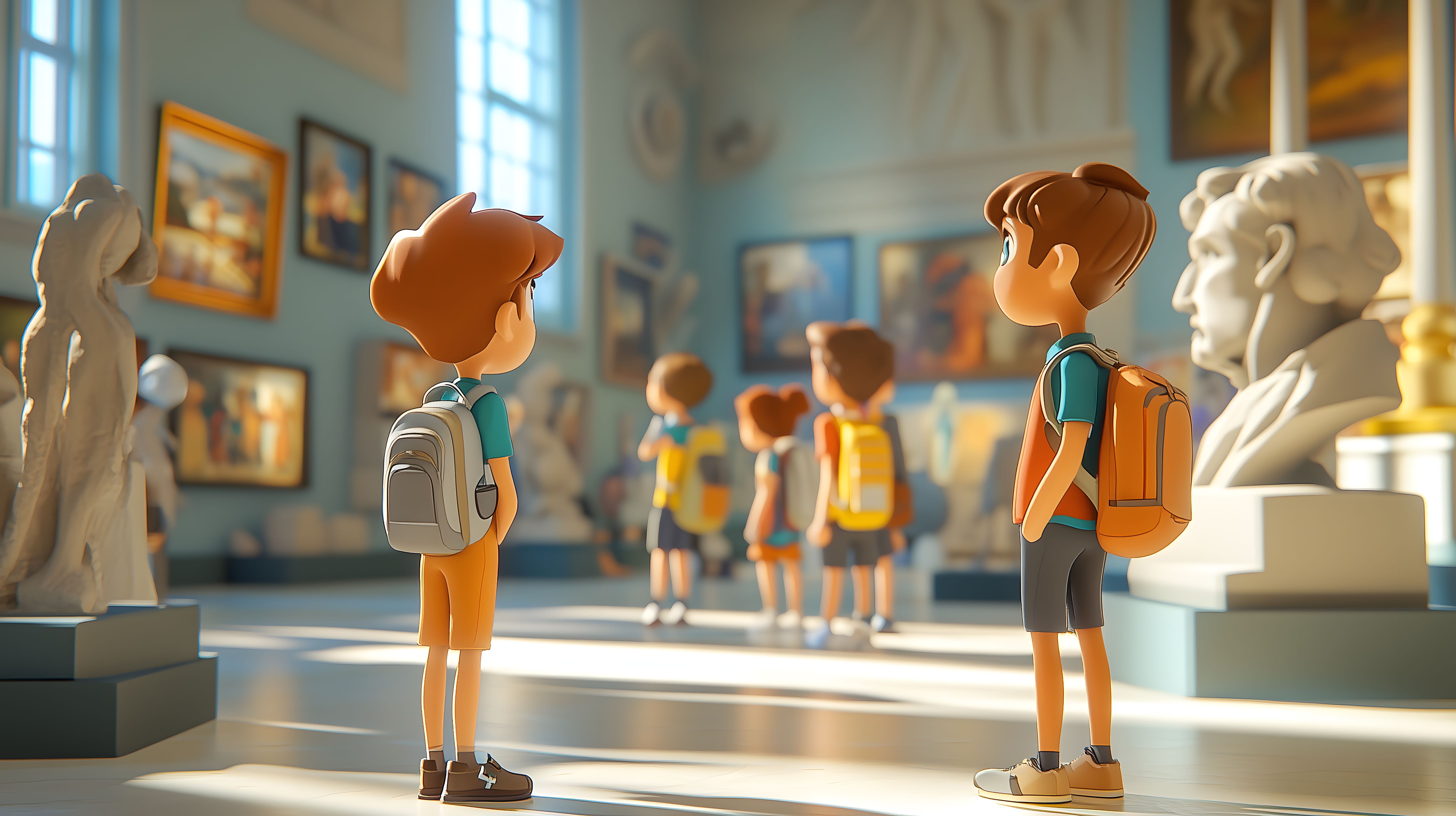 Das Bild zeigt eine Gruppe von Schülern, die eine Kunstausstellung in einem Museum besuchen. Die Kinder stehen andächtig vor den Exponaten, darunter Gemälde und Skulpturen, und scheinen von den Kunstwerken fasziniert zu sein. Die Perspektive ist leicht erhöht, sodass man einen Überblick über den Ausstellungsraum mit seinen hohen Decken und historischen Gemälden an den Wänden erhält. Die warmen Farbtöne und die sanfte Beleuchtung schaffen eine einladende Atmosphäre, die zum kreativen Entdecken und Lernen einlädt.