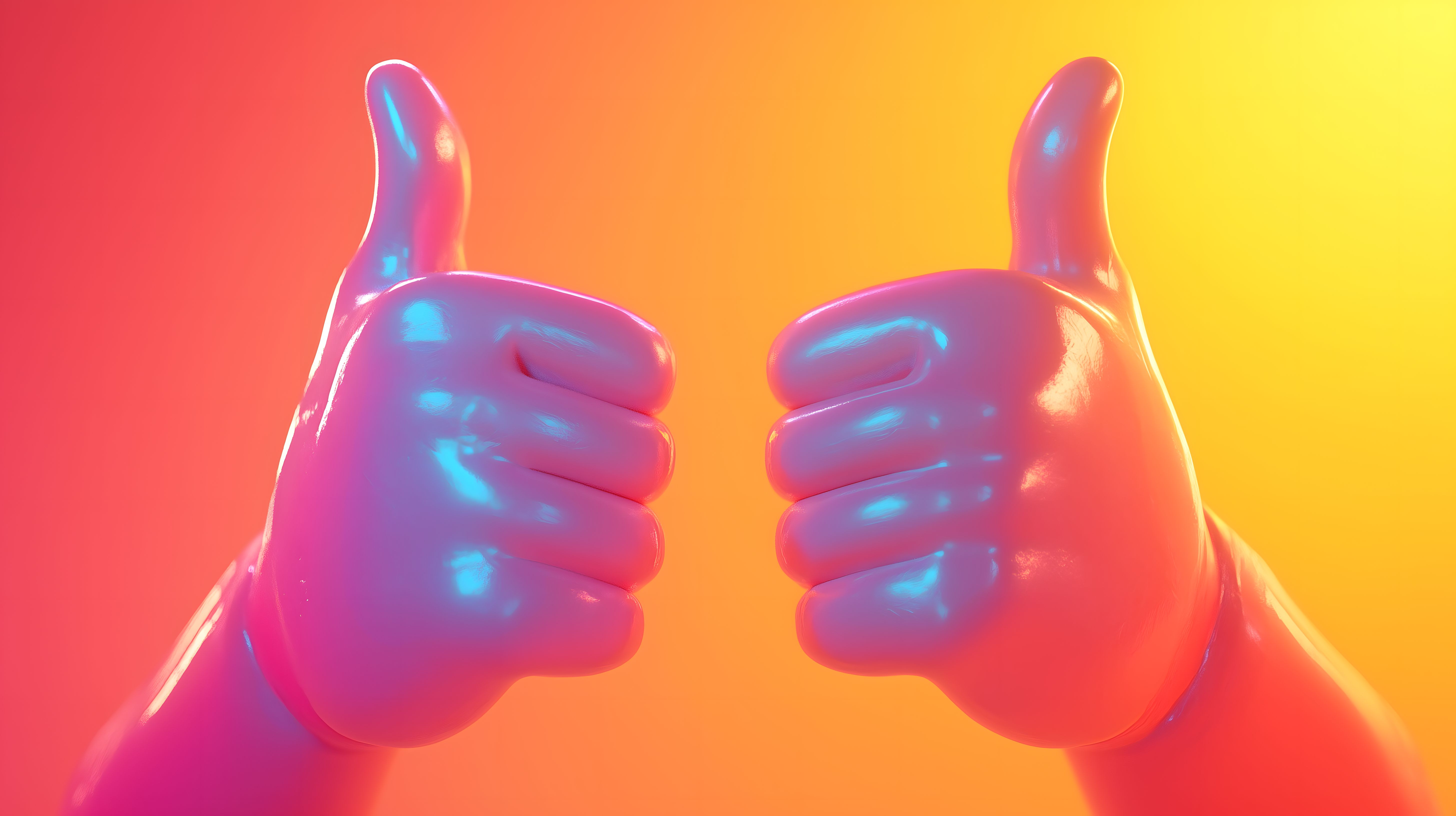 Dieses auffällige Foto zeigt zwei Hände, die einen kräftigen Daumen-hoch-Gruß in strahlenden, neonartigen Farbtönen von Pink, Blau und Lila senden. Der Kontrast zwischen den intensiven Farben und dem schlichten orangefarbenen Hintergrund lässt die Geste besonders hervorstechen und verleiht dem Bild eine lebendige, dynamische Ausstrahlung.