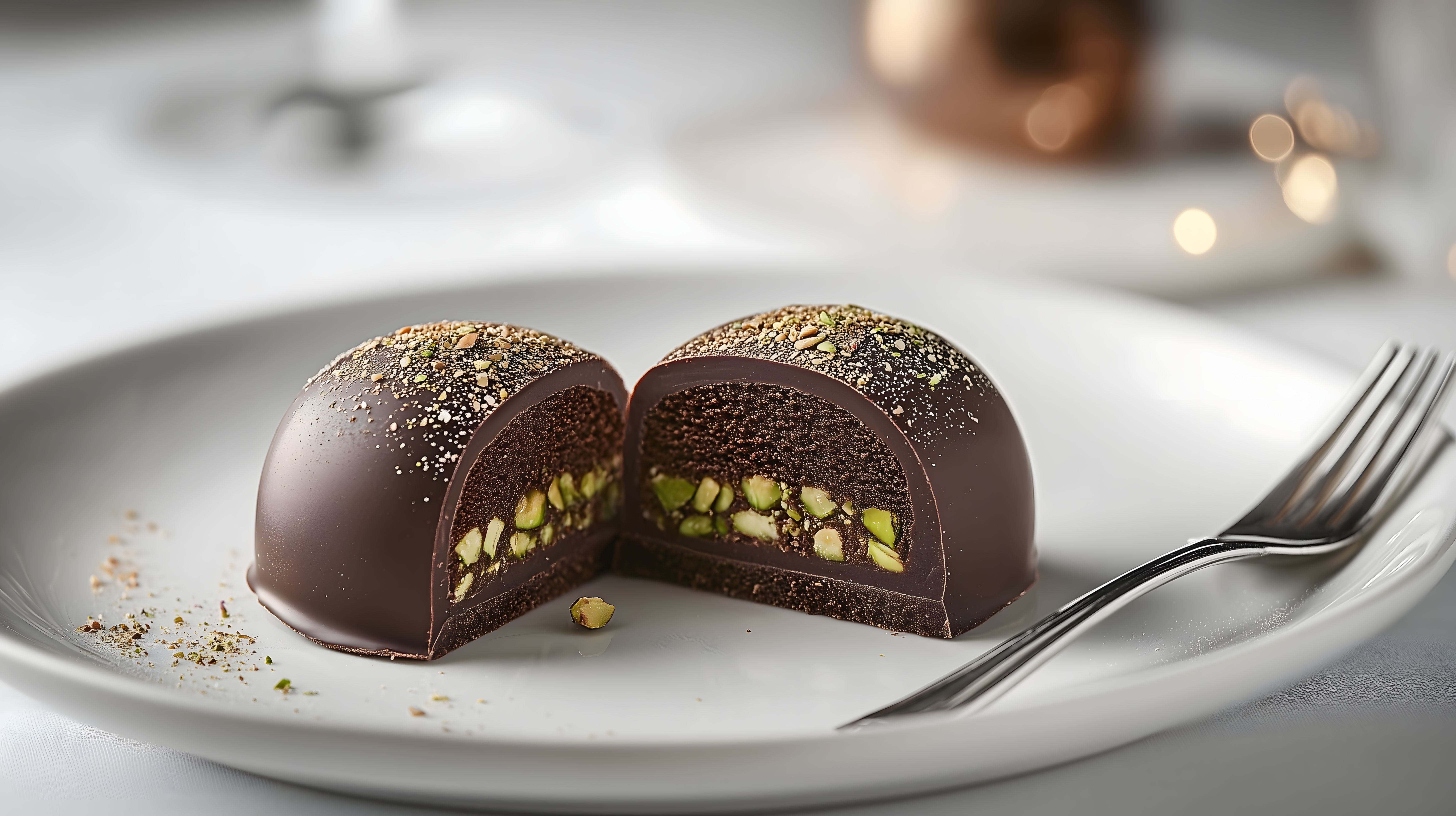 Dieses hochwertige Stockfoto zeigt zwei delikate Schokoladentrüffel mit einer glatten, glänzenden Glasur und einer grünen Pistazienpralineneinlage. Die Trüffel liegen auf einem schlichten weißen Teller, der durch die weichen Unschärfeeffekte im Hintergrund betont wird. Das Foto strahlt Eleganz, Exklusivität und hohen Genuss aus und eignet sich hervorragend für die Verwendung in kulinarischen Blogs, Magazinen, Social-Media-Beiträgen oder Werbematerialien für Confiserien und Patisserie-Anbieter. Das Bild liegt in hoher Auflösung und unter einer Creative-Commons-Lizenz vor, sodass es kostenfrei für verschiedenste Zwecke genutzt werden kann.