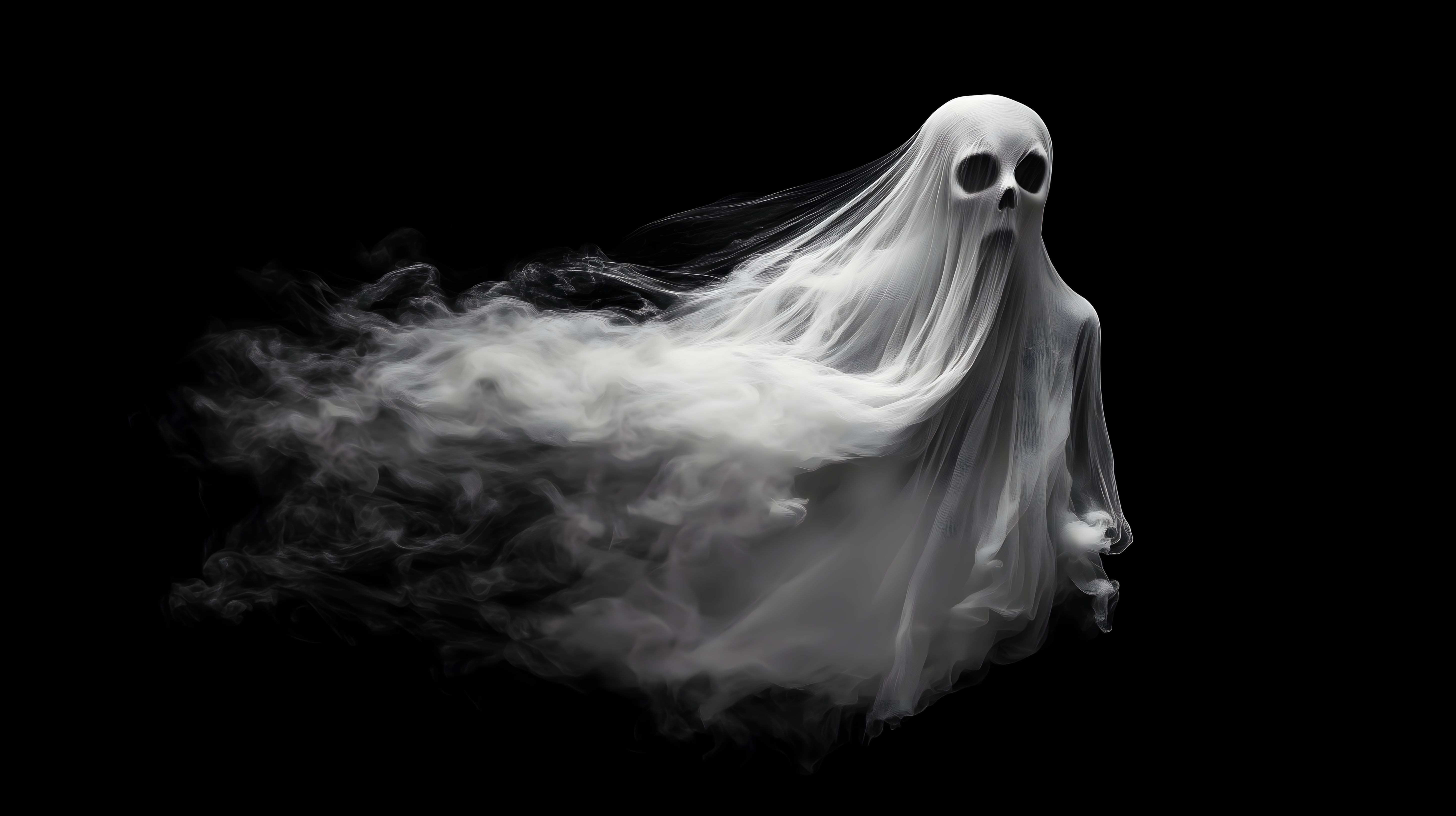 Dieses eindrucksvolle Schwarz-Weiß-Foto zeigt ein nebelhaftes, spukhaftes Wesen vor einem dunklen Hintergrund. Das Gespenst erscheint fast durchscheinend und wird von flatterndem, luftigem Gewand umhüllt. Der düstere, mystische Eindruck wird durch die kontrastreiche Darstellung und die reduzierte Farbpalette verstärkt. Dieses Stockfoto eignet sich hervorragend für Halloween-Dekorationen, gruselige Veranstaltungen oder als Titelbild für entsprechende Blogbeiträge und Social-Media-Posts. Das hochaufgelöste Bild steht unter Creative-Commons-Lizenz kostenfrei zum Download bereit.