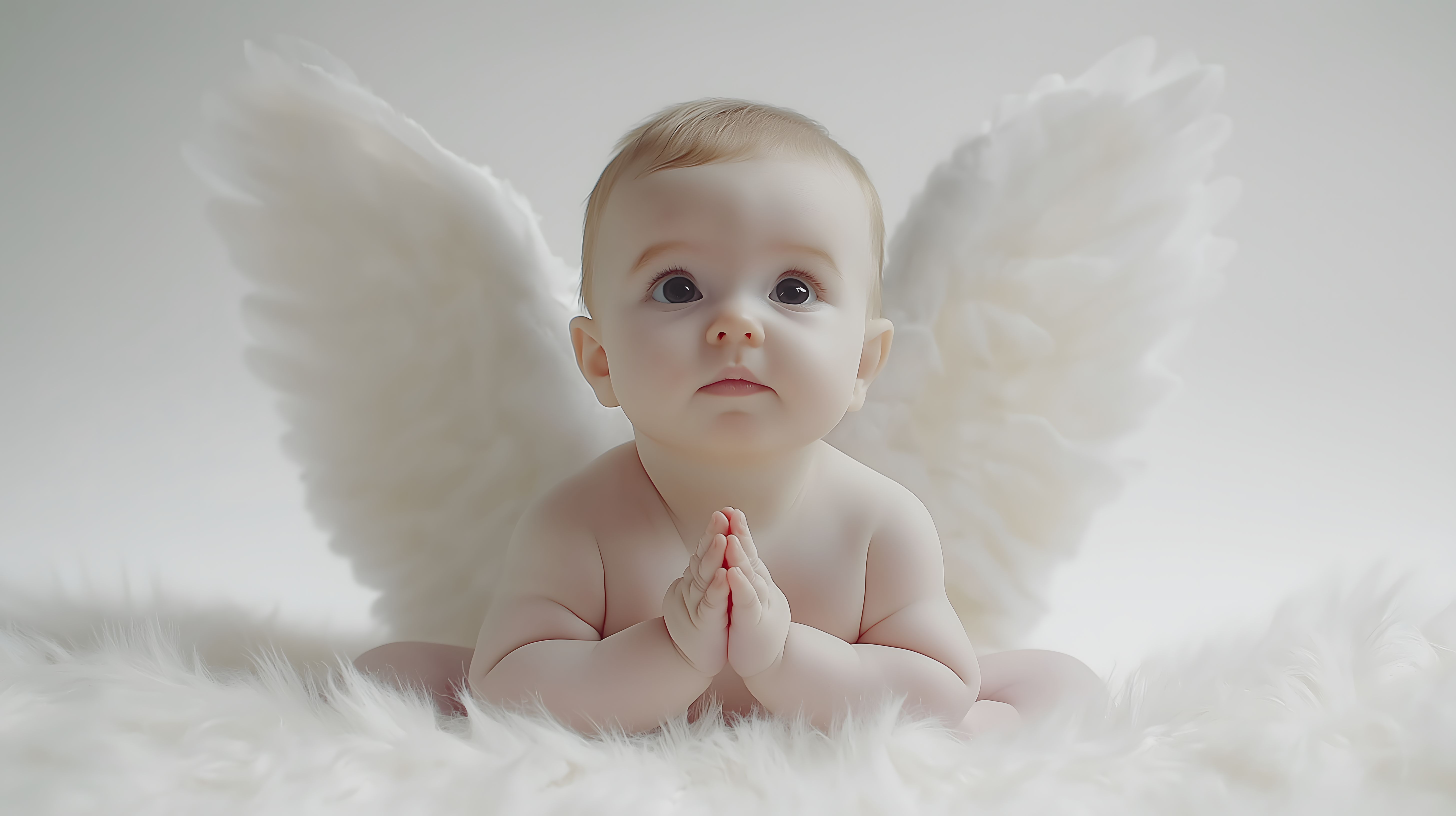 Das Bild zeigt ein Baby in Engelskostüm mit weißen, flauschigen Flügelchen, das in betender Haltung auf einer weichen Unterlage sitzt. Das Kind blickt nachdenklich in die Kamera, mit seinen großen, dunklen Augen und dem unschuldigen Gesichtsausdruck. Die Komposition ist minimalistisch, mit weißen Tönen, die den Fokus ganz auf das himmlische Motiv lenken. Dieses kostenlose, hochauflösende Stockfoto im Creative-Commons-Stil eignet sich perfekt für Blogs, Newsletter, Social-Media-Beiträge oder Werbematerialien mit spirituellen, religiösen oder kindlichen Themen. Die zarte, engelhafte Darstellung vermittelt Hoffnung, Fürsorge und Anbetung.