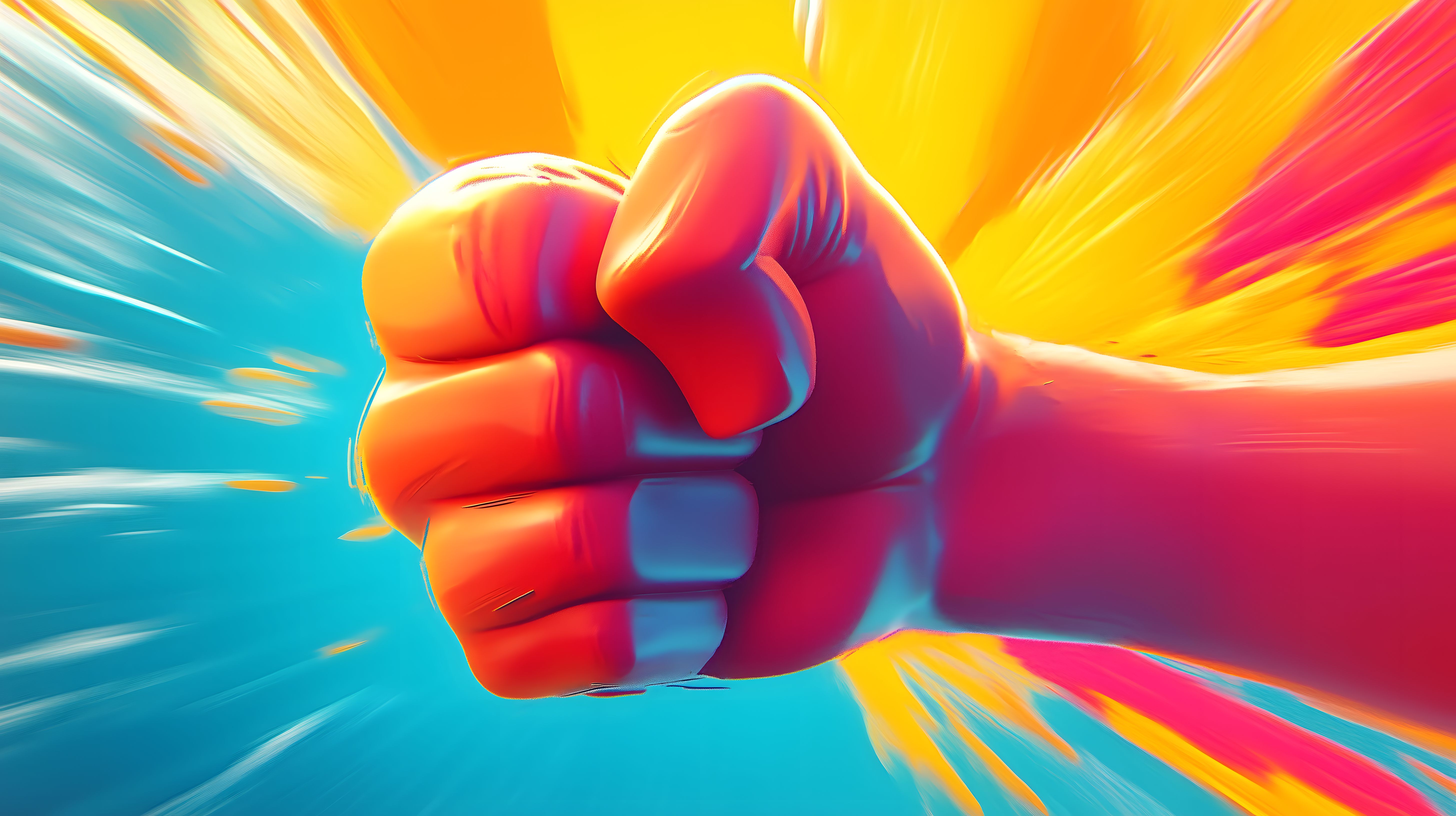 Das Bild zeigt eine dynamische Perspektive eines Faustschlages in kräftigen, kontrastreichen Farben. Der Fokus liegt auf einer geballten Faust, die sich in einer ruckartigen Bewegung aus dem Bild heraus zu bewegen scheint. Die Komposition und Farbgebung verleihen dem Motiv eine gewaltige, aggressive Ausstrahlung. Dieses Stockfoto eignet sich hervorragend für Anwendungen in Bereichen wie Sport, Kampf, Motivations- oder Actionwerbung. Es ist in hoher Auflösung verfügbar und unter einer Creative Commons-Lizenz kostenlos für viele Verwendungszwecke nutzbar.