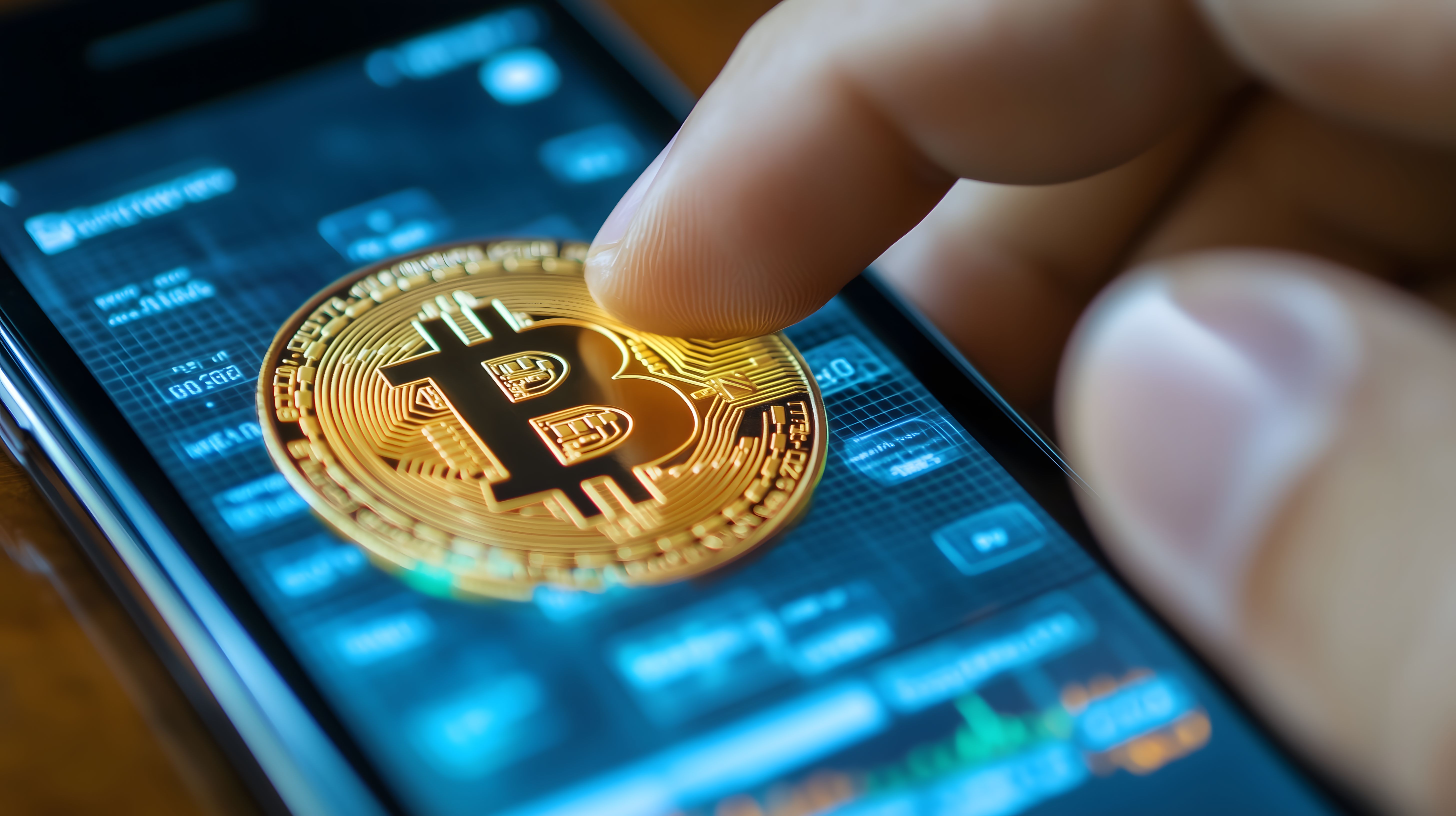 Das Foto zeigt eine Nahaufnahme einer goldenen digitalen Bitcoin-Münze, die auf dem Display eines Smartphones platziert ist. Die Finger einer Hand berühren vorsichtig die Münze, was den Fokus auf die Interaktion zwischen dem physischen und dem digitalen Element verstärkt. Das blaue Hintergrundraster des Smartphone-Displays vermittelt einen modernen, technischen Kontext für die Kryptowährung. Dieses Stockfoto eignet sich ideal für Beiträge zu Themen wie digitale Finanzen, Investitionen, Handel mit Kryptowährungen oder die Zukunft des Geldes. Es ist in hoher Auflösung verfügbar und unter einer Creative-Commons-Lizenz frei nutzbar.