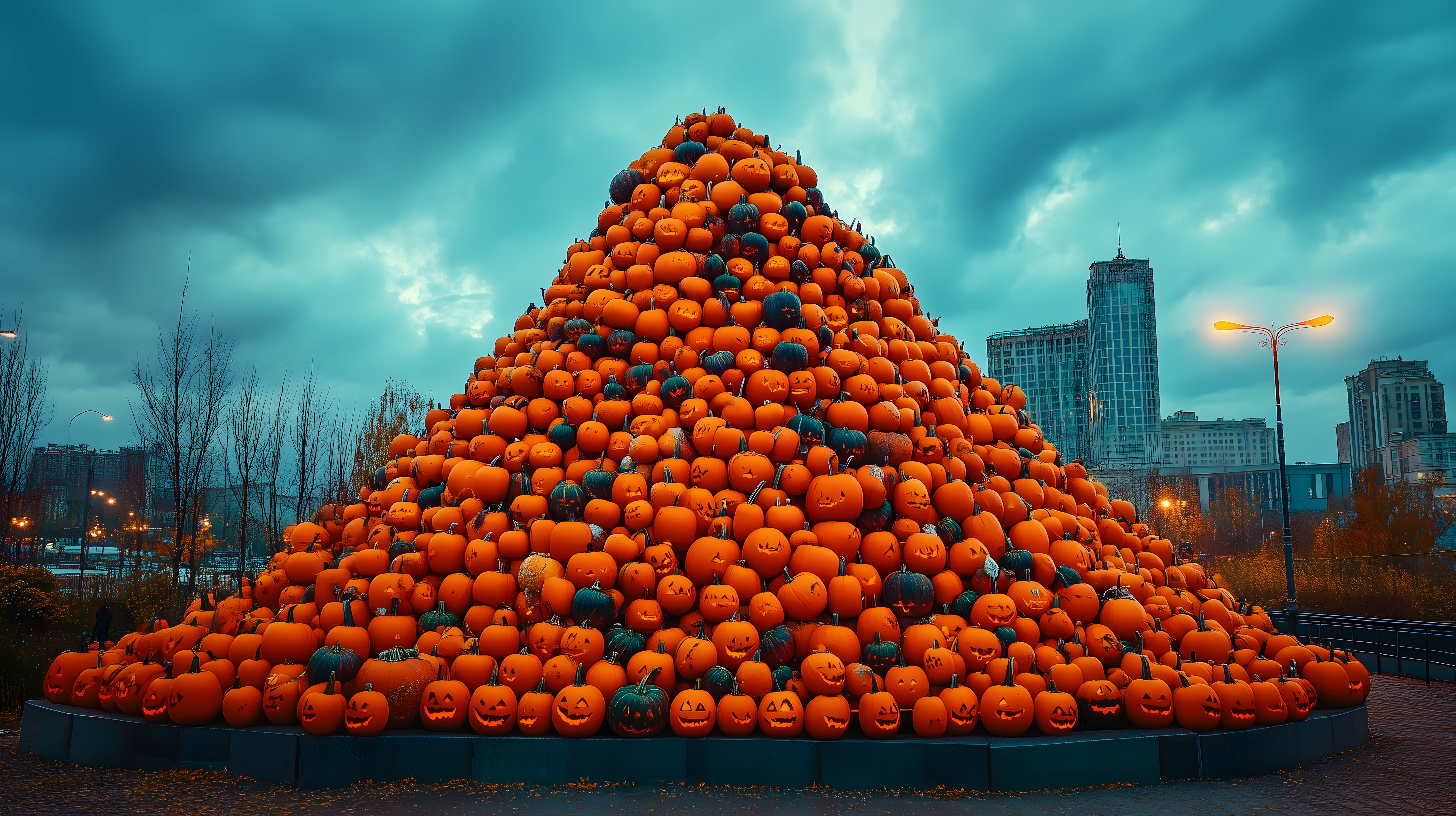 Das Bild zeigt eine beeindruckende Pyramide aus zahlreichen orange leuchtenden Kürbissen, die als Herbstdekoration auf einem öffentlichen Platz in einer Stadt aufgestellt wurde. Die Pyramide erhebt sich vor einer Skyline mit modernen Hochhäusern, wobei der dramatische, bewölkte Himmel einen kontrastreichen Hintergrund bildet. Die leuchtenden Kürbisse in unterschiedlichen Größen und Formen verleihen der Szene einen festlichen, herbstlichen Charakter und laden zum Entdecken und Fotografieren ein. Dieses einzigartige, kostenlose Stockfoto in hoher Auflösung kann perfekt für Herbst-Werbekampagnen, Newsletter-Designs, Social-Media-Posts oder Blogbeiträge über Dekorationsideen für die Herbstzeit verwendet werden und steht unter einer Creative-Commons-Lizenz zur Verfügung.