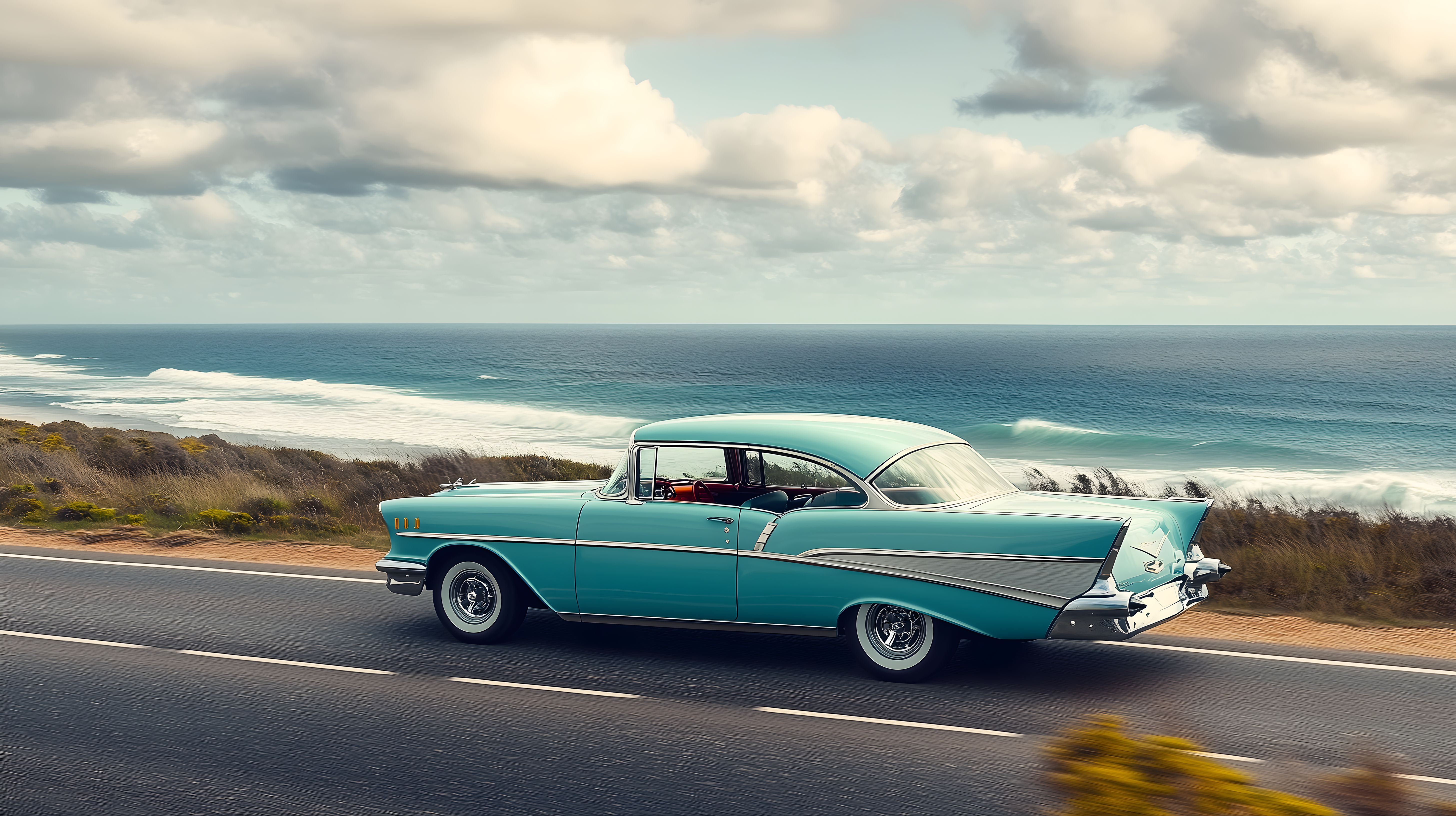 Dieses Stockfoto zeigt einen wunderschönen klassischen Oldtimer, der an einer malerischen Küstenstraße entlangfährt. Der türkisfarbene Wagen mit weißem Dach fährt über eine kurvenreiche Straße, die den Blick auf einen weiten, azurblauen Ozean und einen bewölkten Himmel freigibt. Die Szene strahlt Ruhe, Freiheit und Nostalgie aus und ist ideal für den Einsatz in Reise-, Tourismus- oder Automobilkampagnen geeignet. Dieses hochauflösende Foto steht unter einer Creative-Commons-Lizenz zur kostenlosen Verwendung zur Verfügung.