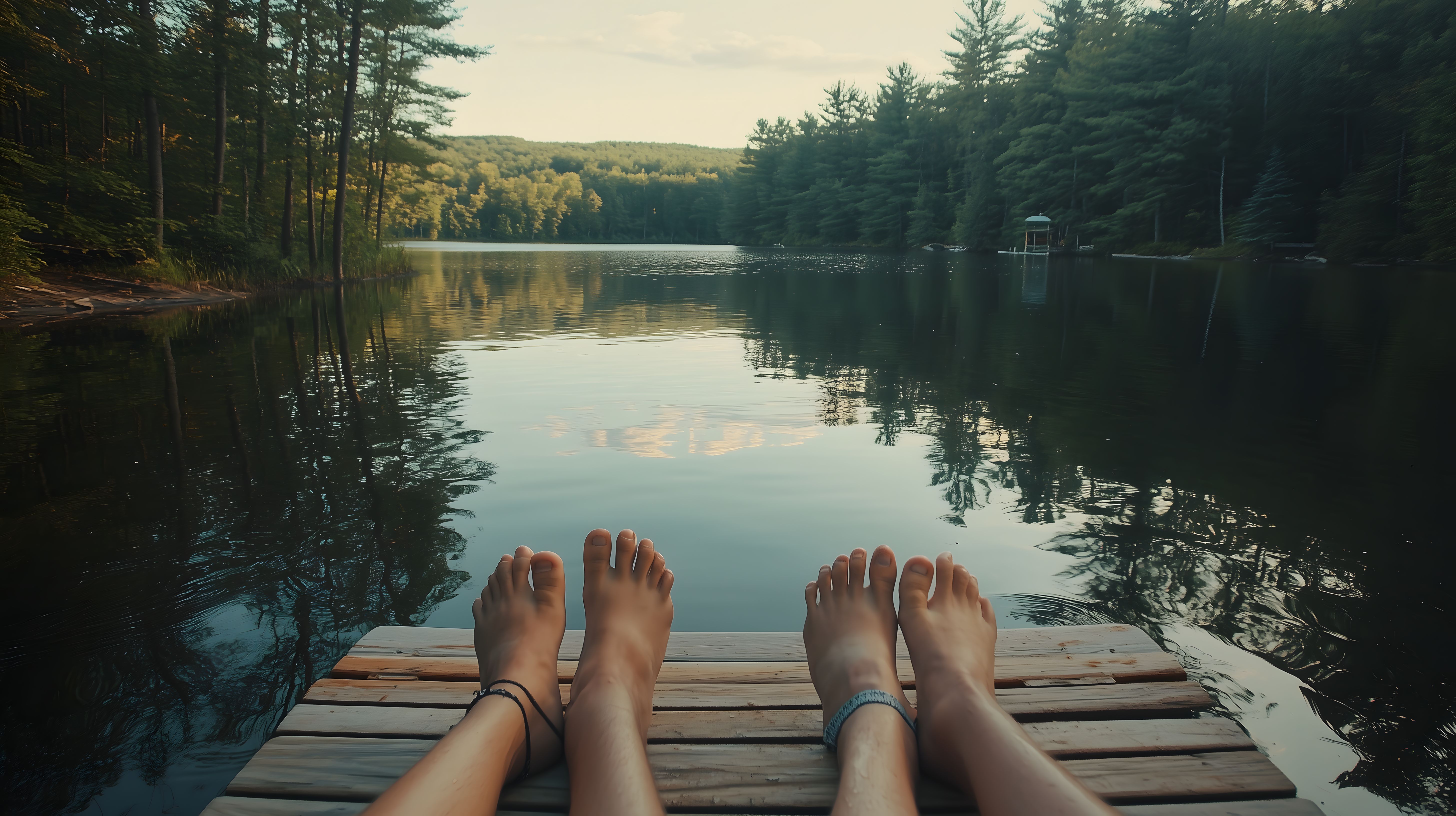 Das Bild zeigt einen ruhigen, friedlichen Moment auf einem Holzsteg, der in einen See hineinragt. Die Füße der Person, deren Identität nicht erkennbar ist, sind im Vordergrund zu sehen, während sich im Hintergrund eine malerische Landschaft mit Wald, Bergen und einem Sonnenuntergang spiegelt. Die Szene strahlt Ruhe, Erholung und Entspannung aus und eignet sich hervorragend als stimmungsvolles Titelbild für Blogs, Newsletter oder Social-Media-Posts, die sich mit Themen wie Natur, Outdoor-Aktivitäten oder Wellness befassen. Dieses hochauflösende, kostenlose Stockfoto unter Creative-Commons-Lizenz lässt sich vielfältig einsetzen.