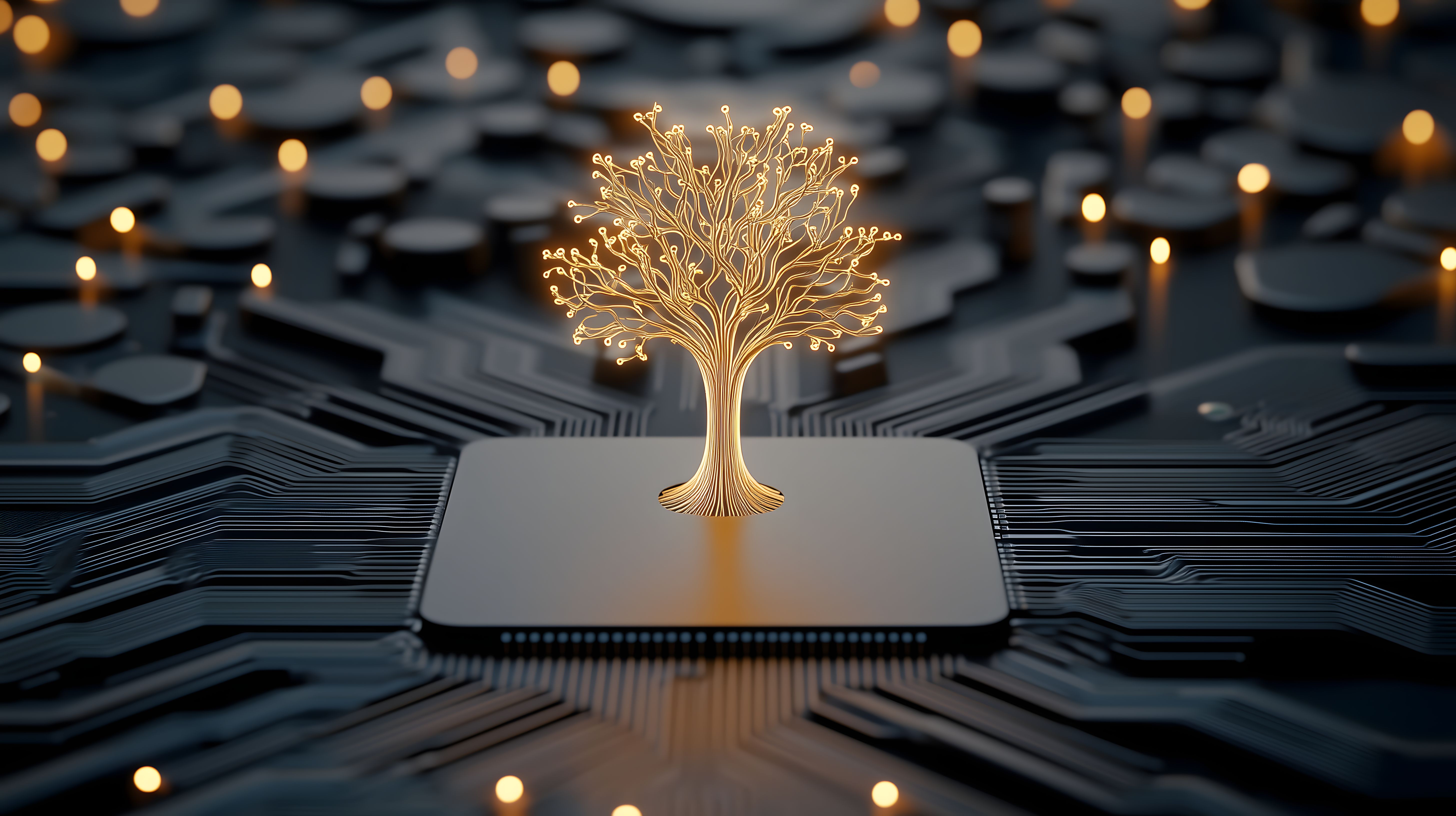 Das Bild zeigt einen goldenen, beleuchteten Baum, der aus einem Mikrochip oder einer Leiterplatte wächst. Es vermittelt ein Konzept von digitaler Innovation, technologischem Fortschritt und Konnektivität. Die abstrakte, minimalistische Darstellung mit den dunklen Hintergründen und Lichtreflexen erzeugt eine moderne, futuristische Atmosphäre. Dieses Stockfoto eignet sich hervorragend für Hintergründe, Illustrationen oder Grafiken in Blogbeiträgen, Newslettern, Social-Media-Posts oder digitaler Werbung zum Thema Technik, Digitalisierung und innovative Entwicklung. Das hochauflösende Bild steht unter einer Creative-Commons-Lizenz kostenfrei zum Download bereit.