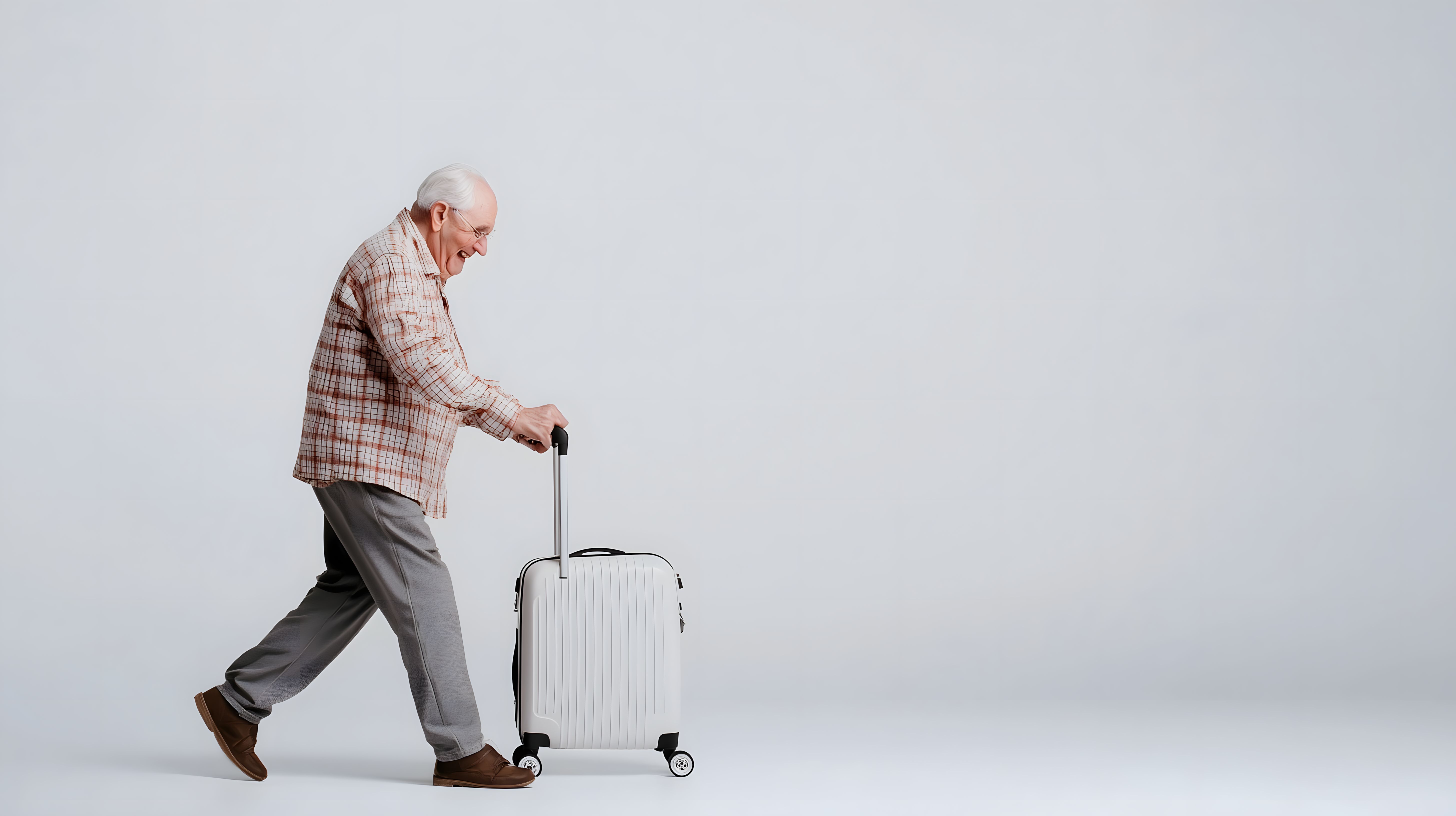 Das Bild zeigt einen dynamischen, älteren Herrn, der mit seinem Gepäckstück auf Reisen zu gehen scheint. Er trägt ein kariertes Hemd und Hosen in Grautönen, was einen lässigen, aber dennoch gepflegten Eindruck vermittelt. Seine aufrechte Haltung und der entschlossene Blick zeugen von Energie und Abenteuerlust, die ihn bei seinen Unternehmungen antreiben. Dieser Eindruck wird durch den großen, weißen Koffer, den er hinter sich herzieht, verstärkt.