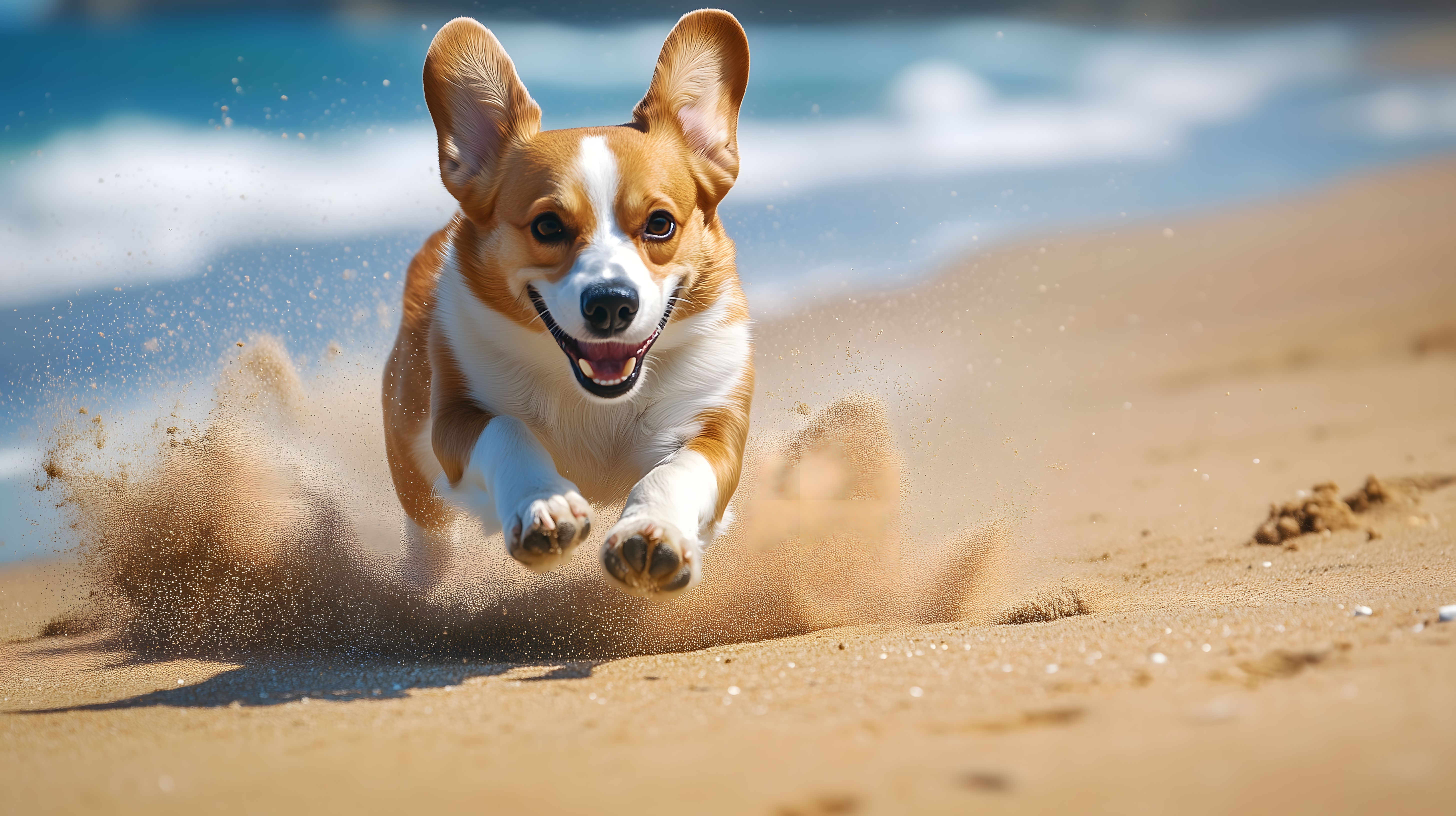 Dieses fröhliche Bild zeigt einen Hund, der am Strand mit Freude läuft und springt. Der Hund ist eine Corgi-Rasse mit einem weichen, orangefarbenen Fell und einem fröhlichen Gesichtsausdruck. Im Hintergrund sieht man den blauen Ozean und den sandigen Strand, was eine friedliche und idyllische Stimmung vermittelt. Dieses Foto eignet sich hervorragend für die Verwendung in Blogs, Newslettern, Social-Media-Posts oder Werbematerialien, die eine positive und lebendige Atmosphäre schaffen möchten. Es ist ein kostenloses, hochauflösendes Stockfoto, das unter einer Creative-Commons-Lizenz verfügbar ist.