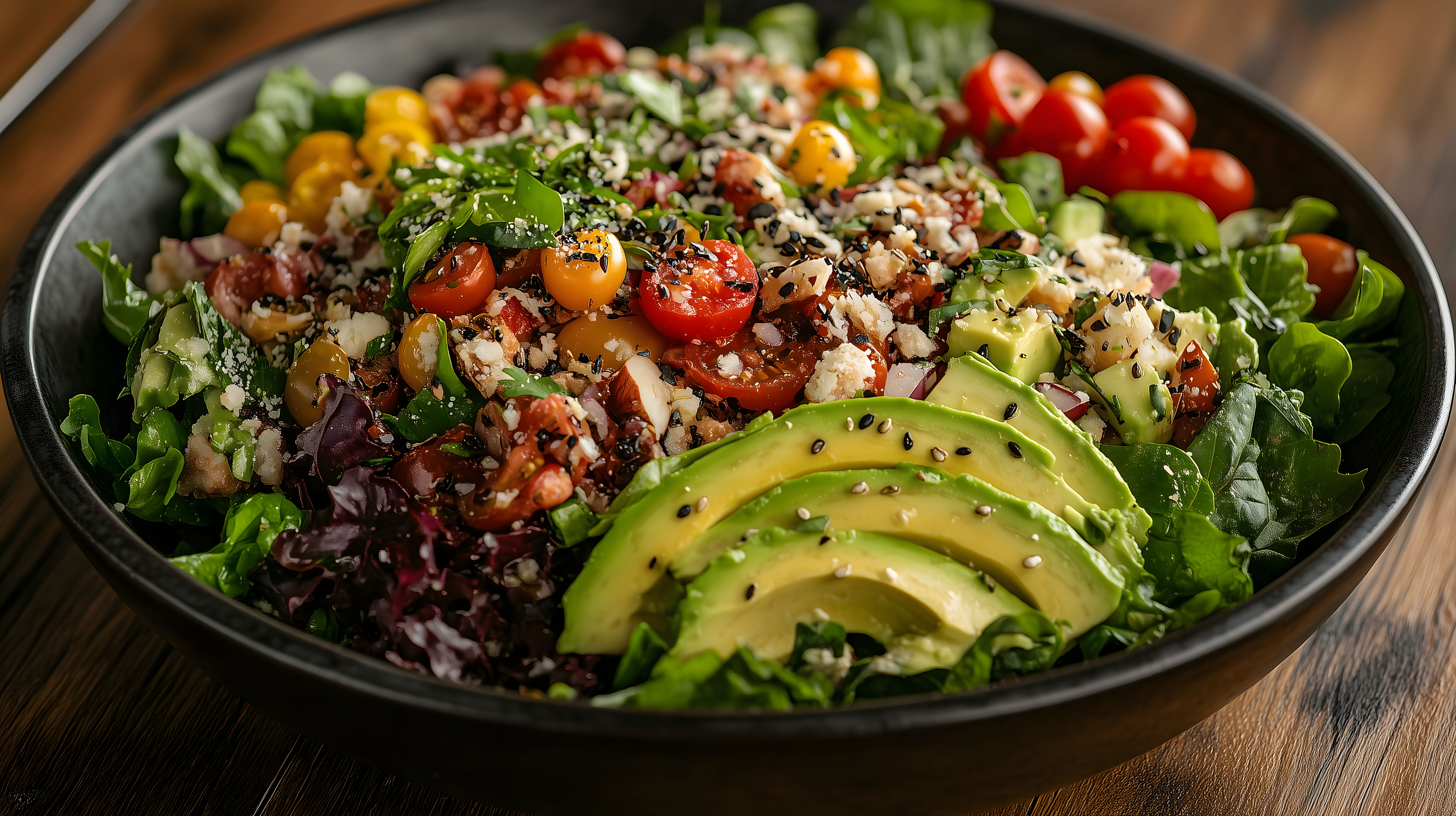 Dieses Foto zeigt einen appetitlich angerichteten, frischen veganen Salat in einer rustikalen Schüssel auf einem Holztisch. Der Salat enthält eine Mischung aus grünem Salat, Avocadoscheiben, bunten Kirschtomaten und Sesamsamen. Die Zutaten sind liebevoll und stilvoll angeordnet, sodass das Gericht nicht nur gesund, sondern auch sehr ästhetisch aussieht. Dieses hochwertige Stockfoto eignet sich hervorragend für den Einsatz in Blogs, Newslettern, auf Social-Media-Kanälen oder in Werbematerialien zum Thema gesunde, vegane Ernährung. Es ist in hoher Auflösung verfügbar und kann unter den Bedingungen der Creative Commons-Lizenz kostenfrei genutzt werden.