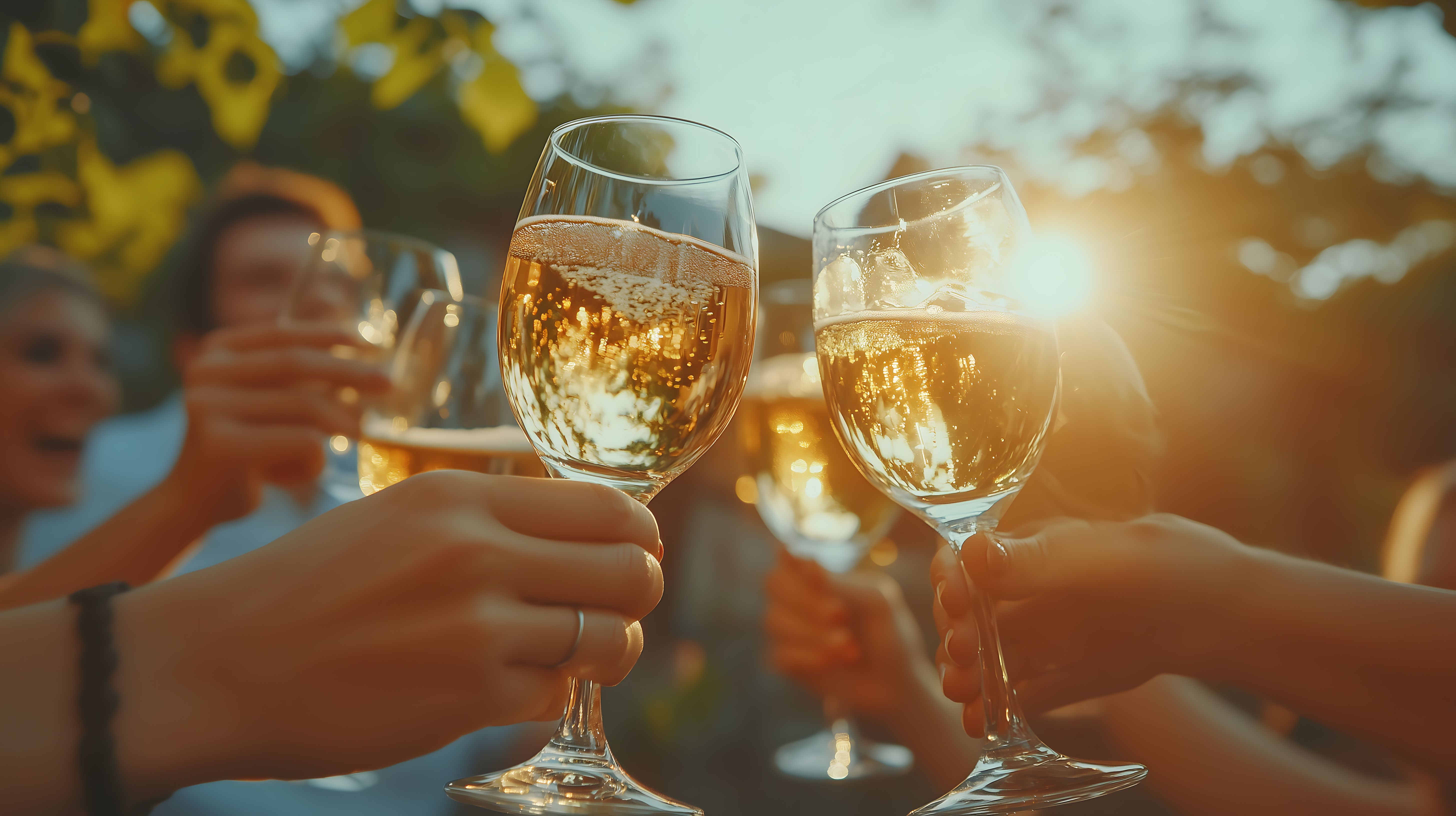 Das Bild zeigt zwei Hände, die Champagnergläser halten und bei einem Fest im Freien mit dem Glas anstoßen. Die Gläser funkeln im Sonnenlicht und vermitteln eine fröhliche, ausgelassene Stimmung. Der Hintergrund ist verschwommen, sodass der Fokus ganz auf den Gläsern liegt. Dieses Stockfoto eignet sich hervorragend für die Verwendung in Blogs, Newslettern, Werbekampagnen oder sozialen Medien, um eine festliche, sommerliche Atmosphäre zu schaffen. Es ist in hoher Auflösung und unter einer Creative-Commons-Lizenz verfügbar.