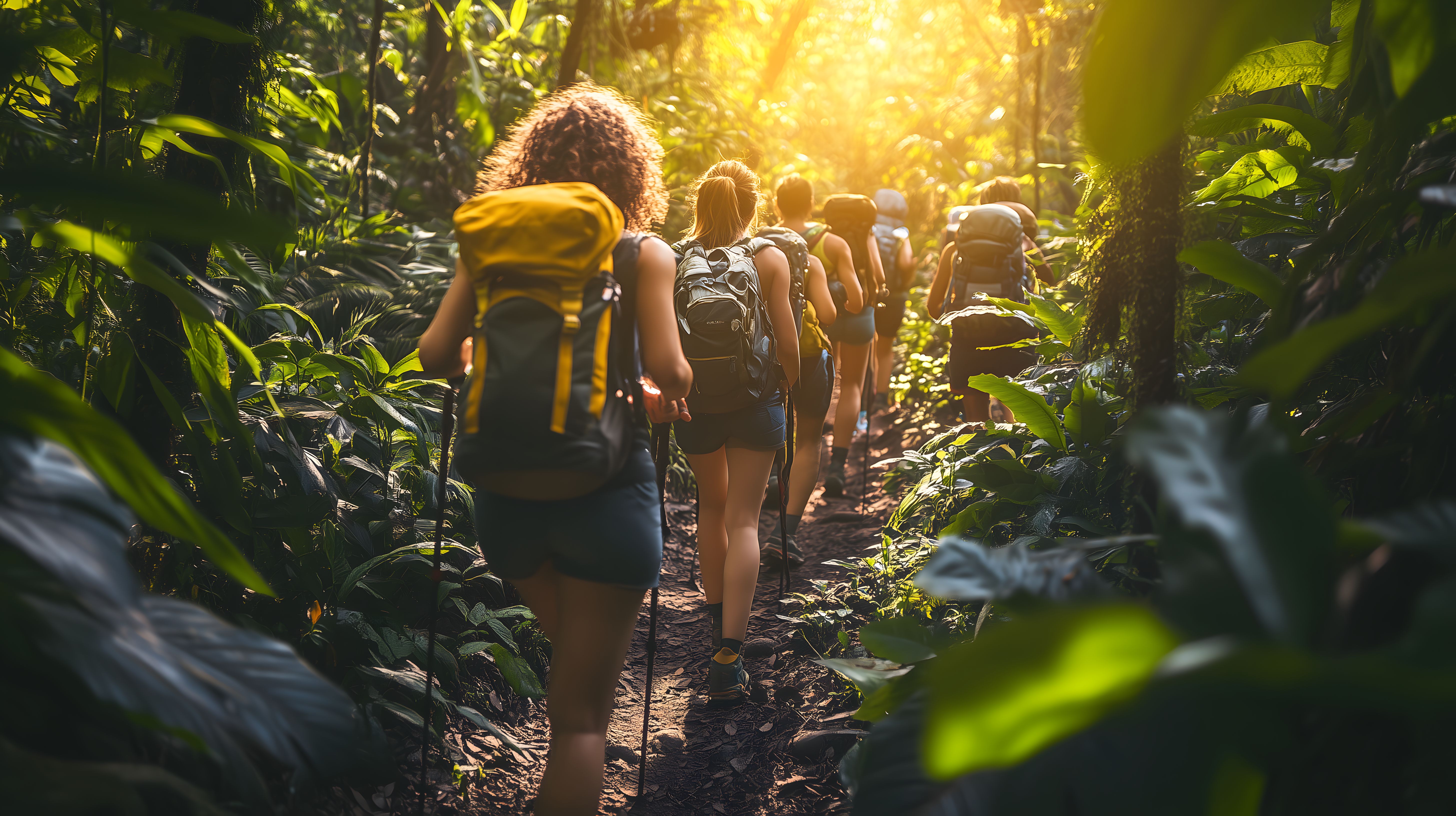 Das Bild zeigt eine Gruppe von Wanderern, die auf einem schmalen Pfad durch einen dichten, tropischen Dschungel laufen. Die Sonne bricht durch das dichte Blätterdach und taucht die Szene in ein warmes, goldenes Licht. Die Wanderer tragen Rucksäcke und Trekkingstöcke, was auf eine längere Reise hindeutet. Die Umgebung ist üppig grün und die Vegetation wirkt luxuriös, was eine Reise in ferne, exotische Gefilde vermittelt.