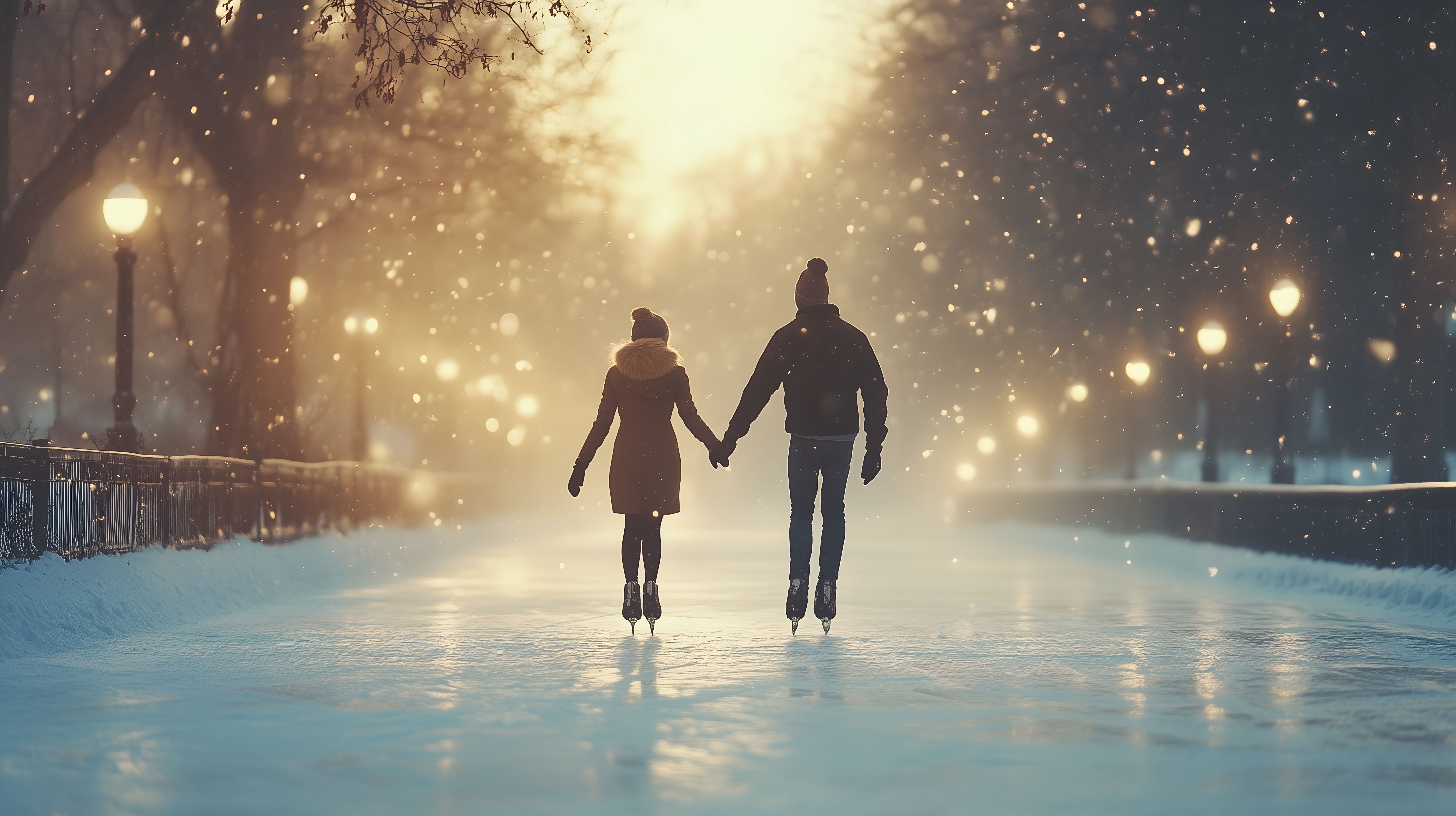 Das Bild zeigt ein Liebespaar, das Händchen haltend über eine verschneite Eisfläche in einer winterlichen Parklandschaft spaziert. Die beiden Personen sind als Silhouetten im Gegenlicht zu sehen, während im Hintergrund Schneeflocken und Straßenlaternen eine stimmungsvolle, beinahe märchenhafte Atmosphäre erzeugen. Das Foto eignet sich hervorragend für Beiträge zu Themen wie Liebe, Romantik, Winter oder Weihnachten in Blogs, Social-Media-Kanälen oder Werbekampagnen. Es ist in hoher Auflösung verfügbar und kann kostenfrei unter einer Creative-Commons-Lizenz genutzt werden.